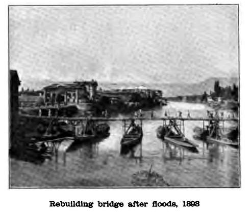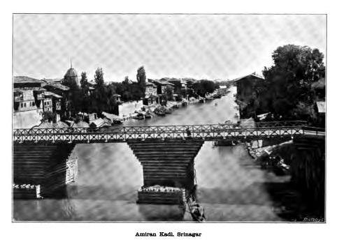 The various bridges (Kadal) under which we passed, the boatmen shouting together in chorus as they worked their hardest to keep the boat steadily in the middle of the stream, were all pf the same type; their foundation are of deaodar piles, then logs of wood about twenty-five to thirty feet long and two or three feet in girth are led two feet apart at right angles, alternately with layers of stone. So piers are built up from about twenty-five to thirty feet in height, and twenty-five feet square. These stand ninety feet apart, and are spanned by long, undressed deodar timbers. The force of the stream is broken by abutments of stones running to a point constructed on the up-stream side. These answer admirably their purpose, stemming the wild rush of waters and standing securely for hundreds of years, even when exceptional floods, like the terrible one of July, ’93, have swept all away. Even on that occasion the first bridge the Amiran Kadal though submerged, stood, but all the others were swept away. This was one of the worst floods ever known in Kashmir, and terrible destruction to city property resulted from it, more than two thousand houses disappearing in it. Mercifully, comparatively few lives were lost, though, of course, the amount of discomfort and misery it caused was very great.