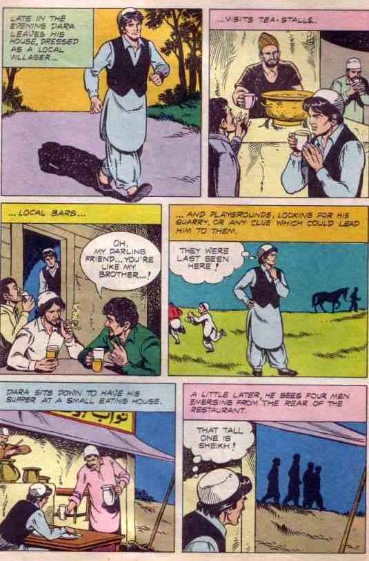 Dara, urf Rana Vikram Bir Singh, urf Raja Saheb, an flamboyant ex-prince of Kashmir who secretly works for Indian Intelligence Wing run by one Mr.Rao. In all there were about 8 issues published after which not only the series but Indrajal too shut shop. Of these 8 issues at least two stories are based in Kashmir – ‘The Savage Mercenary’ (with some of the action taking place on snow capped mountains) and ‘Sparks of Treason’. Of these two, ‘Sparks of Treason’ is the most interesting specimen of ‘Kashmir issue in Indian Comics’.