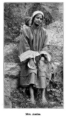 Trusting for some means of escape when the hour had approached, and with a brief command not to create any delicacy that could not be made to get comfortably on my small dish, I tried to improve my acquaintance with the female portion of my crew. My task was not easy, for Mrs. Assiza suffered from shyness and a complete ignorance of all languages save Kashmirian; but I was able, as I tried to make myself understood, to admire her clear, rose-tinted, olive skin, the straight nose and brows, and the fine, brown eyes, set off by the tiny read cap worn under the homespun head-covering folded squarely on the head. The universal frock of puttoo disguised effectively her figure, but the short sleeves turned back with white displayed her well-firmed arms, and the brevity of her “pheran” showed her splendidly-developed calves. Good-looking and strong, like most of her compatriots, the little lady was well up to taking paddle or steering the boat, and during the day worked the long, heavy wooden pestle with astonishing energy as she crushed the grain in her wooden mortar with long, regular movements. The child toddled up to say, “Salaam, Sahib,” nearly falling over its toes in its efforts to bow with reverence and elegance, while clutching tightly a bunch of great purple iris, recently gathered from a Mahomedan graveyard, covering the whole of a small mound near by.