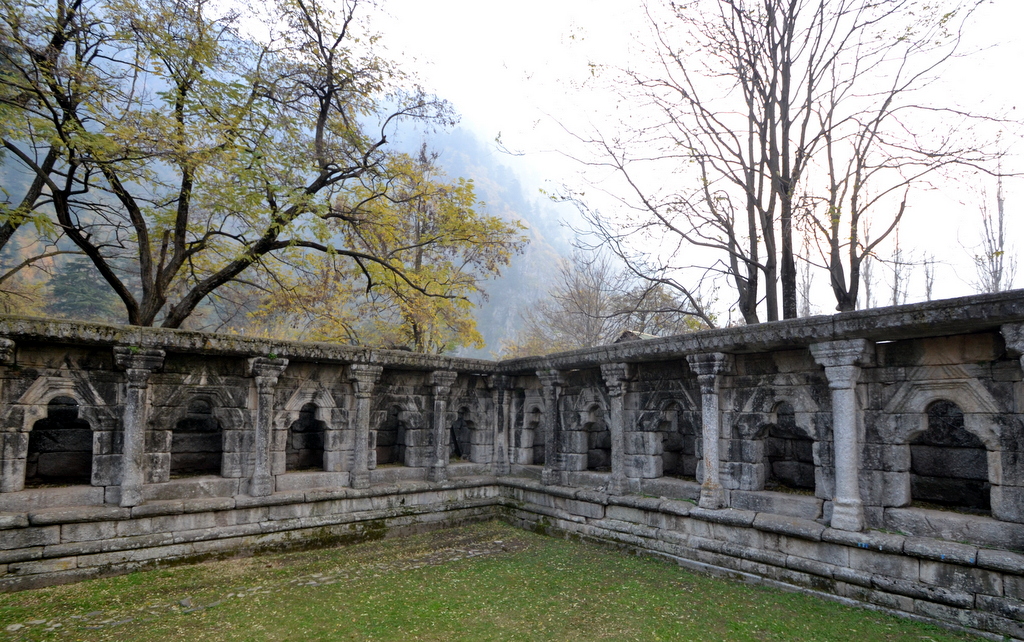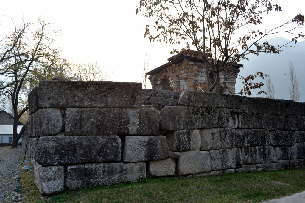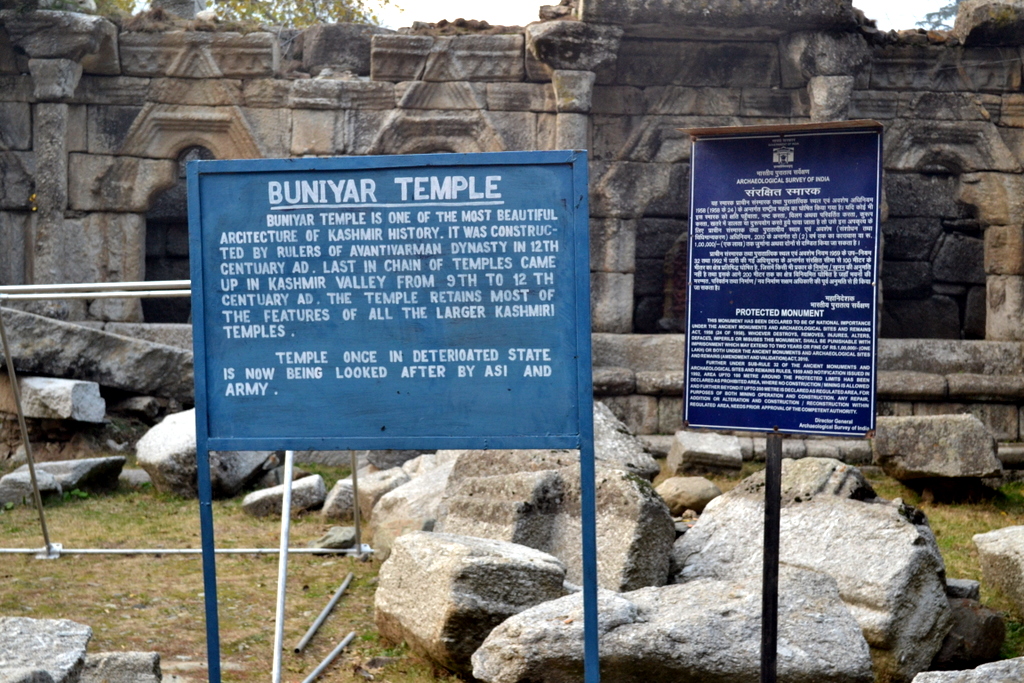 Buniyar Temple, about two miles above Rampur, situated along the Baramula-Uri road on the bank of the Vitasta, is often described as the “best preserved” specimen of Kashmiri architecture. Although unlike most Kashmiri temples which are made of limestone, this one (beside the one at Wangat) is made of granite.