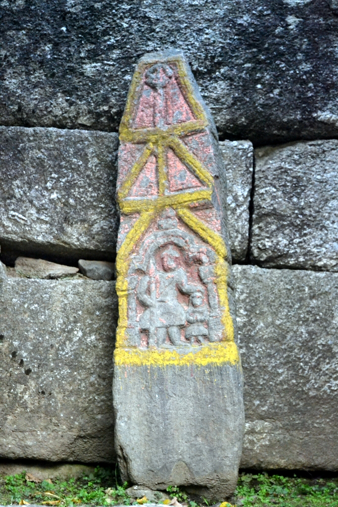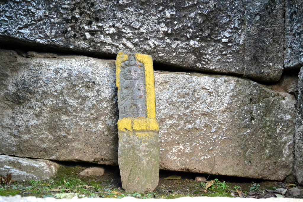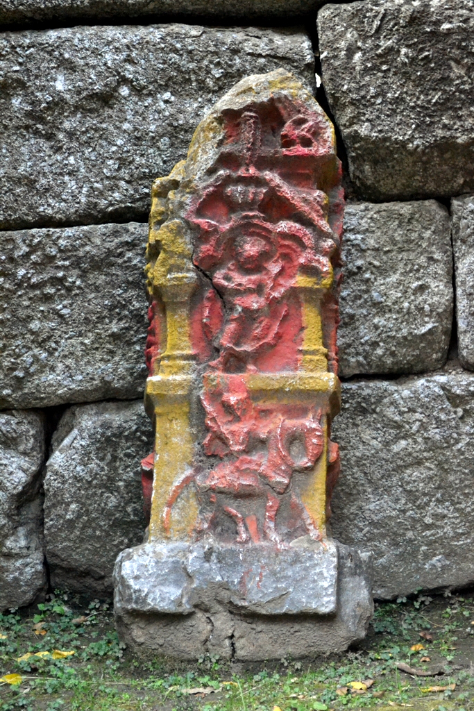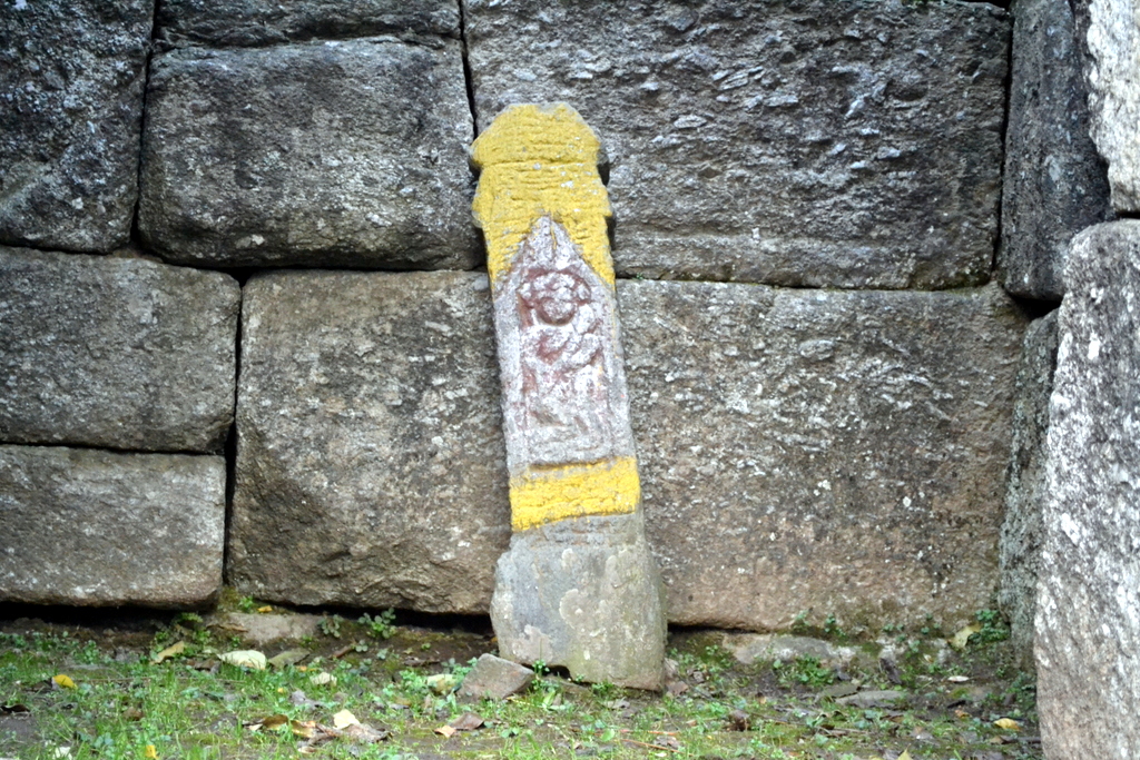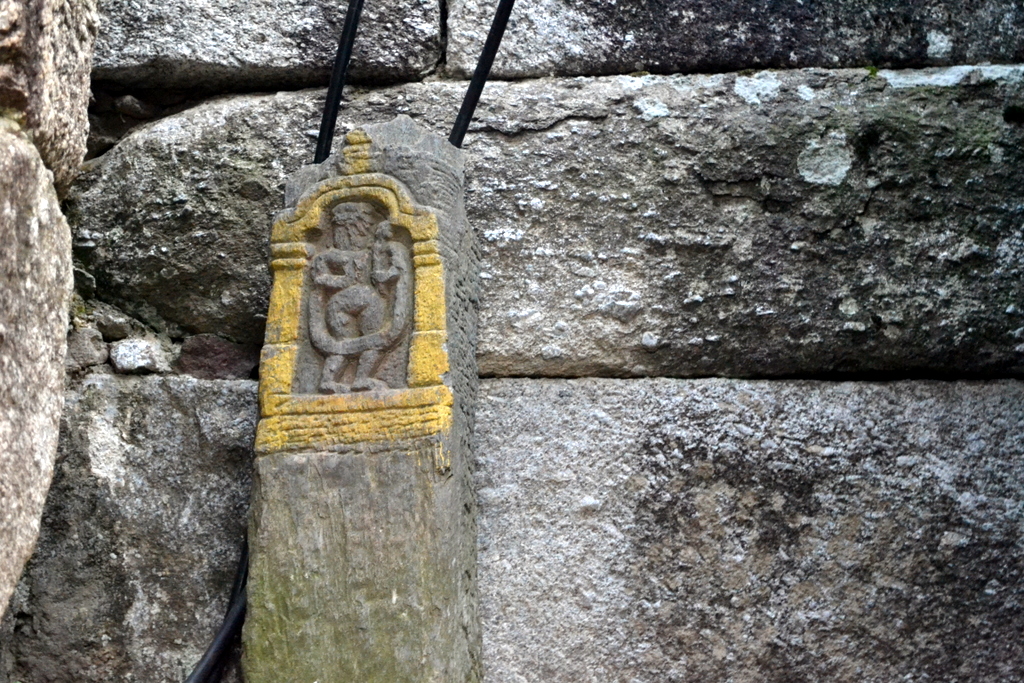 Inside the colonnade are now placed these interesting ancient sculptured stones (again crudely painted over). [Some of them are Hero stones or Sati Stones]