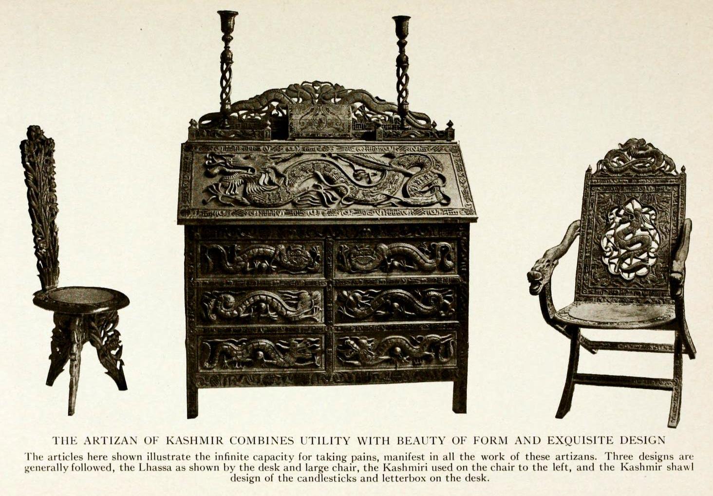 The articles shown here illustrate the infinite capacity for taking pains, manifest in all work of these artizans. Three designs are generally followed, the Lhassa as shown by the desk and Large chair, the Kashmiri used on the chair to the left, and the Kashmir shawl design of the candlesticks and letterbox on the desk.”