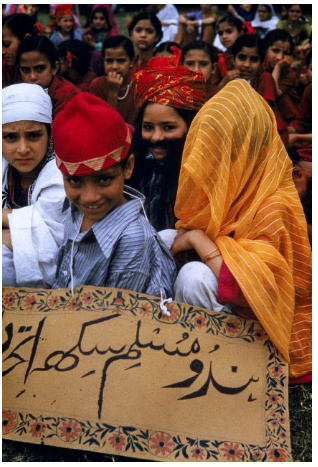 The little girl in green at the back is attired as an elderly traditional Kashmiri Pandit woman.