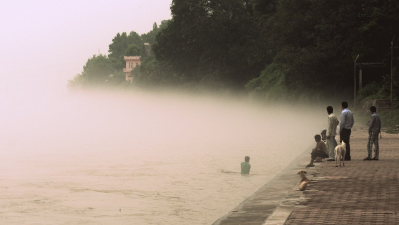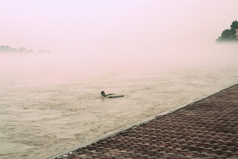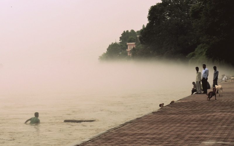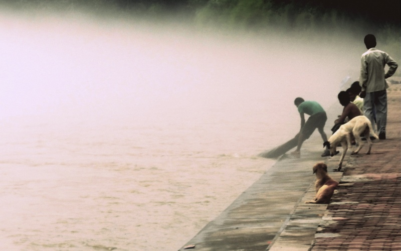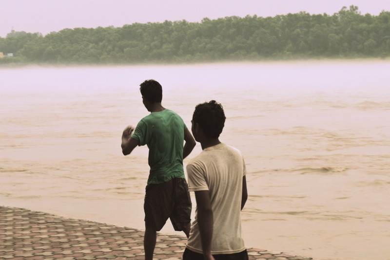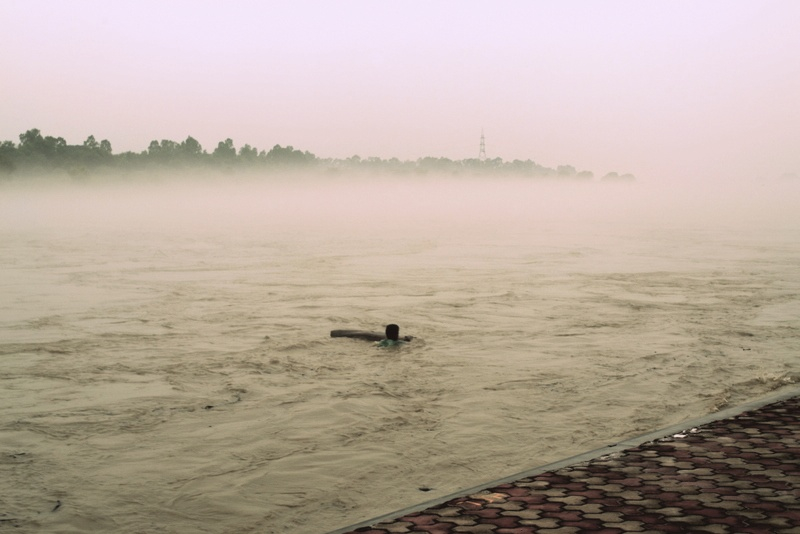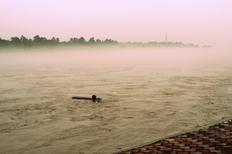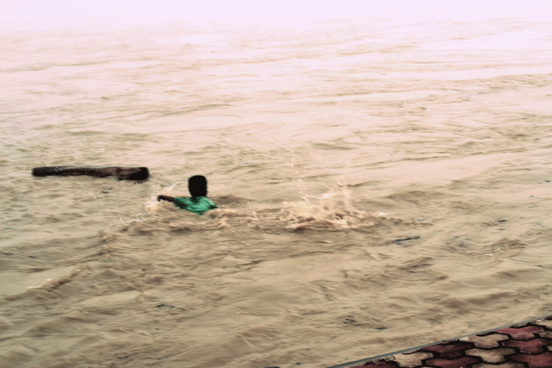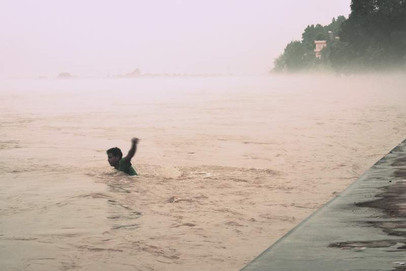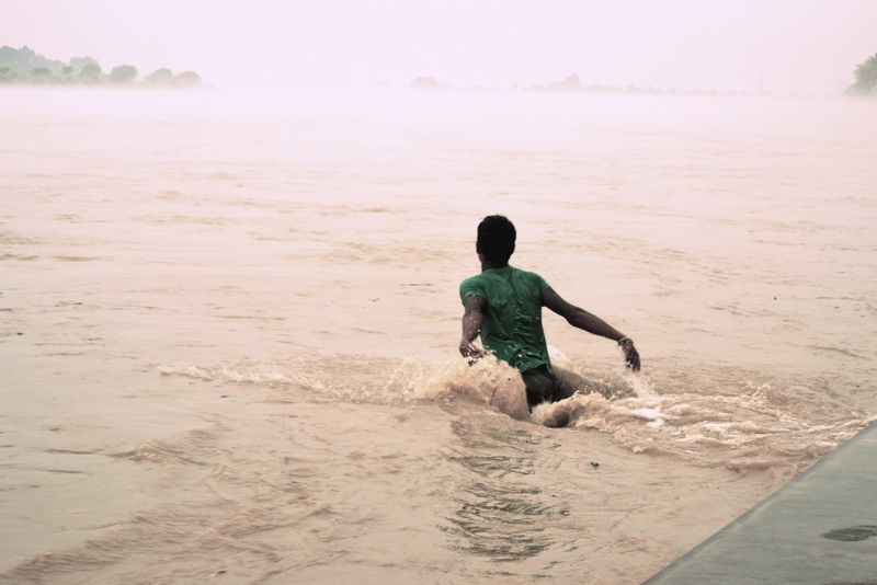 In monsoon when Chenab is in spate, on a flooded ghat can be found a young man trying to make some money by reeling in driftwood logs and a drift trees.