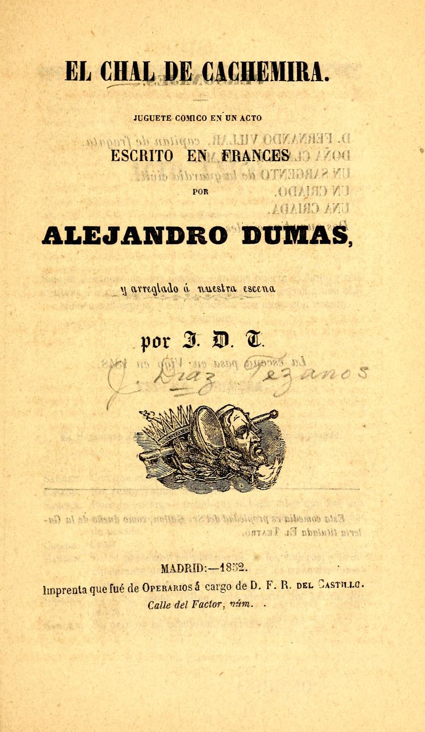 | El chal de cachemira : juguete cómico en un acto (1852) [The cashmere shawl: comic sketch in one act (1852)] Alexandre Dumas (in French) adapted to Spanish by José Díaz Tezanos. |