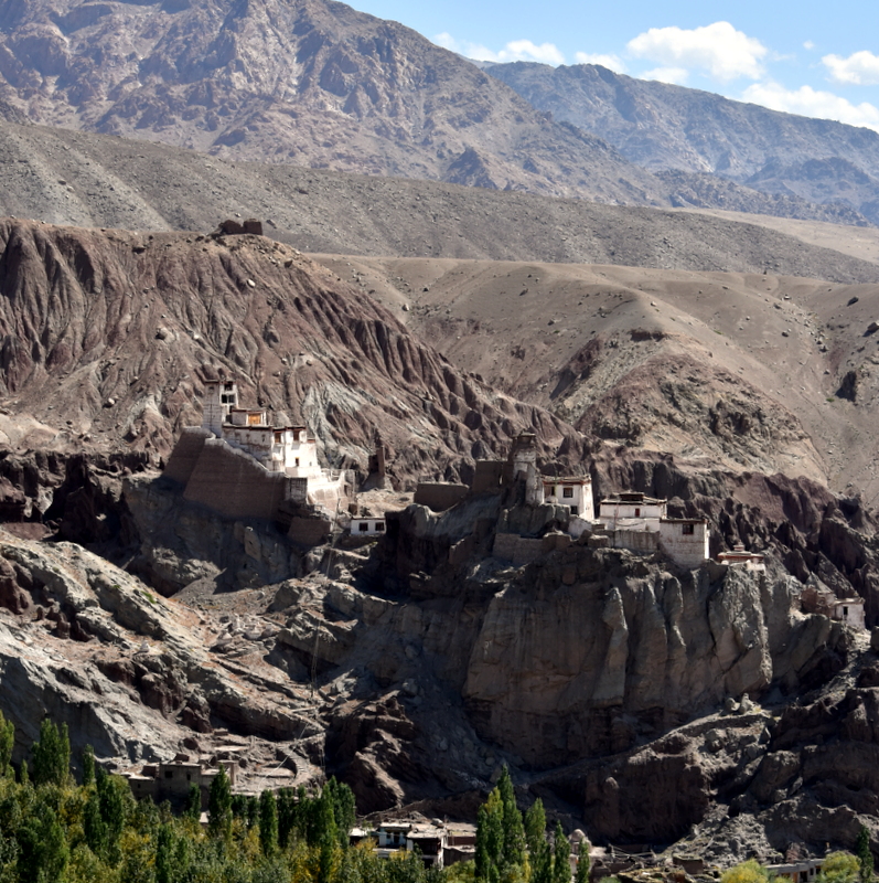 View of plans of Basgo (Bazgu) village with Zangla castle at top of a hill, about 4 miles further of Nimo, about 42 kilometer west of Leh.