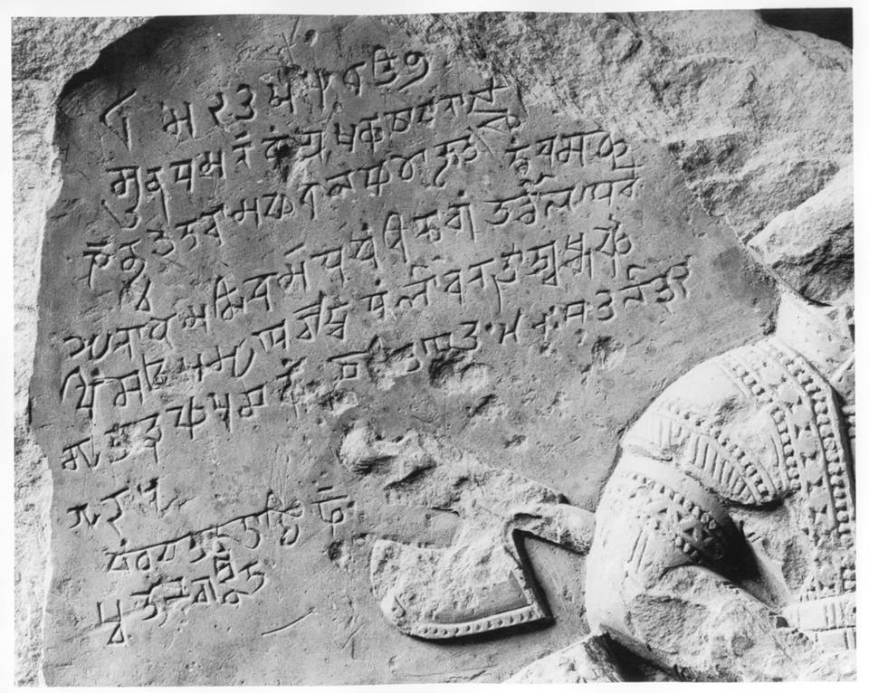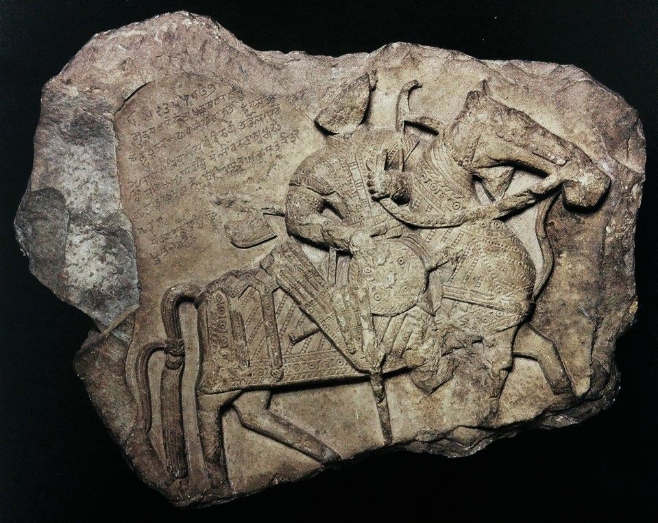 “The relief illustrated in Plate XII was found on the site of Huskapura (modern Ushkur), near Baramula in Kashmir, by Father de Ruyter of the Church Mission School at Baramula [around 1915]. The slab, which is on exhibition in the Fitler Pavilion, bears the equestrian portrait or effigy of a warrior armed with a bow carried on his left arm, a shield and sword on his right thigh, and a battle axe and a quiver full of arrows at his back; also apparently a mace is attached to the saddle. His costume consists of an under coat fastening on the proper right, and an over jacket fastened by straps in the centre; probably also of trousers and boots, but the feet are broken away. The horse is richly caparisoned and almost completely covered by a richly decorated cloth; it is guided by a bridle and bit. The incised inscription, in a late variety of Sārāda script known as Devāśeşa, is damaged; it is in corrupt Sanskrit and not quite intelligible. The date, however, is clearly legible and is ‘on Friday, the ninth, of the dark fortnight of Magha in the year 82.’ The era is not specified, but may be assumed to be the usual Saptarsi or Laukika era of other Kashmir Sārāda inscriptions, which era is usually recorded with omission of the centuries. The year 82 of the inscription would then correspond to the year 6 of one of the Christian centuries, and this century, to judge from the epigraphical peculiarities and the style of the relief was most likely the sixteenth, giving the date A.D. 1506. As to the epigraphy, it may be remarked that medial e is not represented by the stroke behind the consonant as was the case up to the time of Zainu’l-‘Abidīn, King of Kashmir from A.D. 1420-1470. The second line of the inscription which must have contained the name of some king or queen is unfortunately defective. The rest of the document records a gift of goods and animals (twenty khāris of paddy, two of wheat, eight oxen and five traks of coarse sugar); but the names of the donor and recipient are lost. The style of the sculpture is somewhat provincial, but it is of high interest as a rare and almost uniquely complete representation of contemporary military equipment. For much of the information given above I am indebted to Rai Bahadur Daya Ram Sahni, one of the most learned officers of the Archaeological Survey of India.