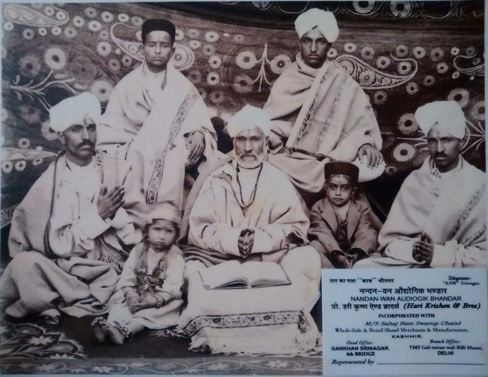 Pt. Swaroop Nath Kaw from Vicharnaag, was the eldest son of Pt. Sahajram Kaw. He was employed as a teacher in a village further away and had to travel a fair distance everyday. He would make a pit stop along the way – which must have been a popular one with people from all walks of life, wool sellers, weavers, embroidery craftsmen etc also crossing roads. Over some time he learnt that the popular shawl/carpet trade was not integrated and artisans only did specific tasks making money at each step. Contrary to his father’s wishes he invested some money in trading and made a neat sum, sufficient to convince his father to accept his decision of diving into the business fully and thus giving up his “cushy” teaching job.