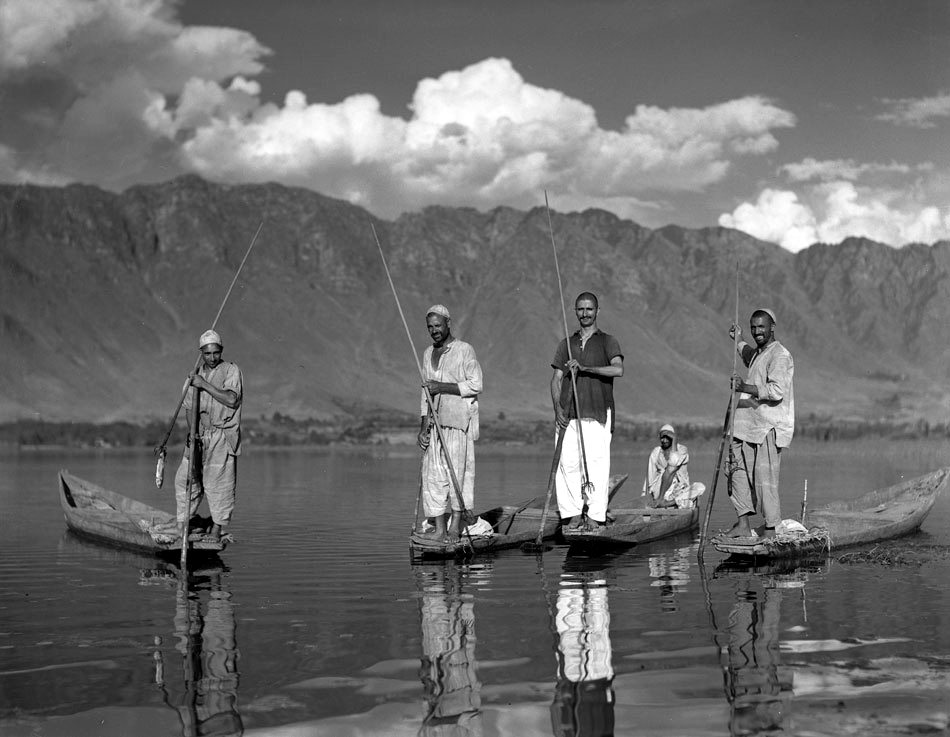 | “Fishermen standing up in boats with spears, Srinigar, Kashmir, 1945” |