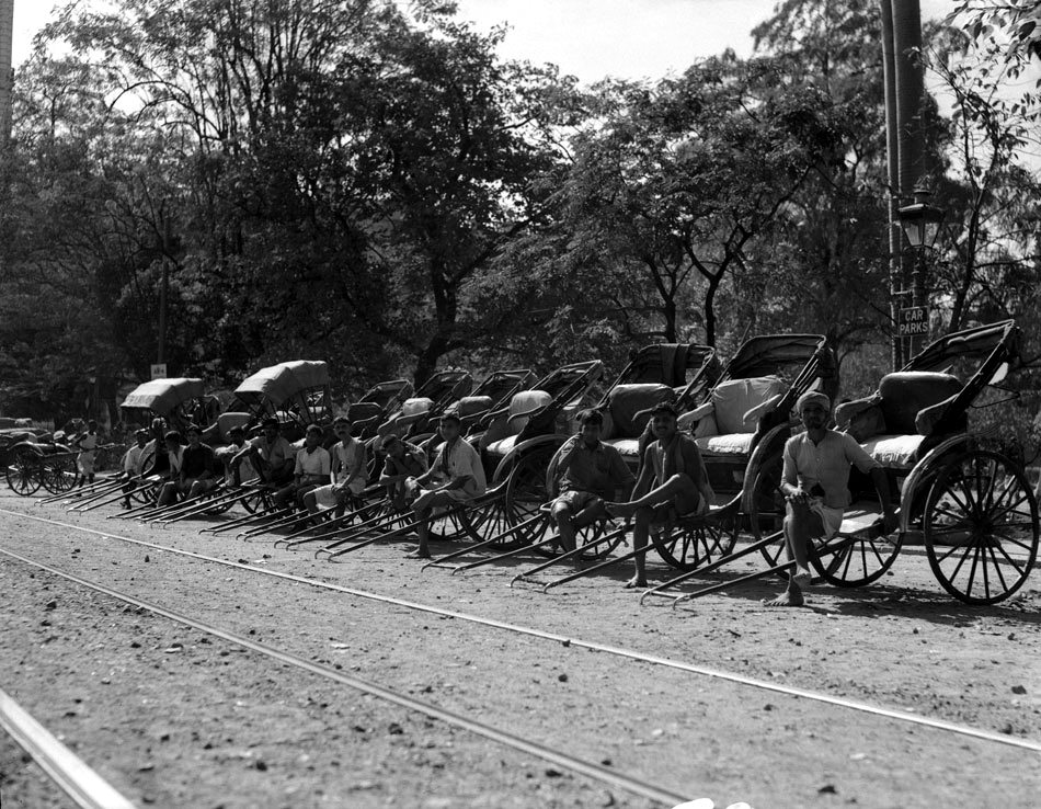| “Public transport rickshaws await passengers, Srinigar, Kashmir, 1945” |