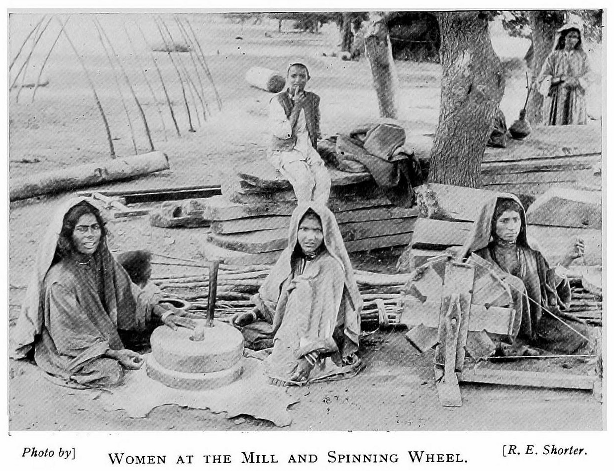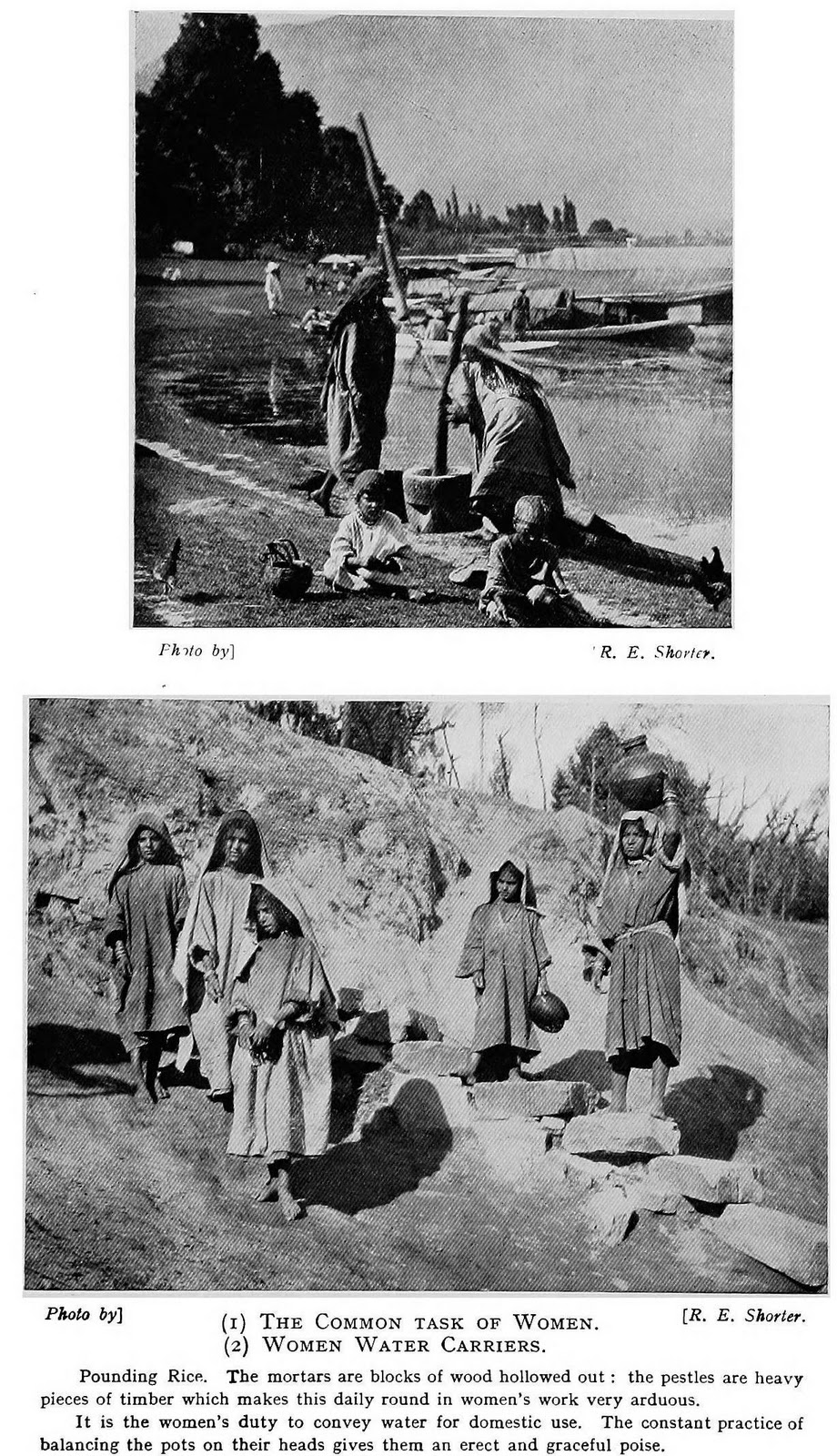 Pounding Rice: The mortars are block of wood hollowed out: the pestles are heavy pieces of timber which makes this daily round in women’s work very arduous.It is the women’s duty to convey water for domestic use. The constant practice of balancing the pots on their heads gives them an erect and graceful poise.