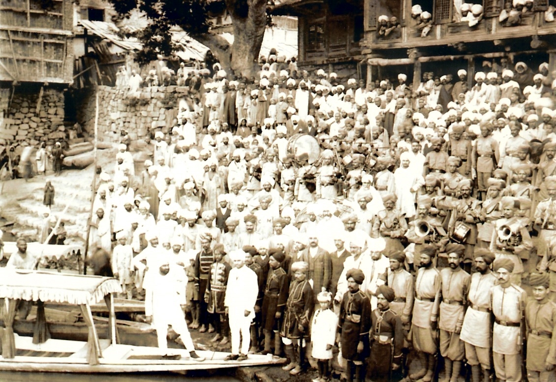 It is the marriage photograph of my late father B.N.Munshi 1904-1977 who retired in early nineteen sixty as the first secretary of J&K Public Service Commission and was employed as Registrar, Regional Engineering College , Srinagar from 1962-1966 . We are original residents of Munshi Mohala Bulbul Lankar. Srinagar. The bearded gentleman standing in the Shikara is my late grand father Munshi Amar Chand and next to him is his son- in- law Late Makund Ram Bhan of Agha Hamam.The band with the procession is the state Band provided by Maharaja Pratab Singh. The bride(Gauri) my late mother is in the Zanpana seen in the center of the photograph with ana; white bearded gentlemen is her Dodbab. The Photograph was taken at the yarbal of Bul Bul Lankar in front of the Ziarat of the sufi saint Bul Bul Shah while the procession was returning by boats from Brari Yarbal near Fateh Kadal.