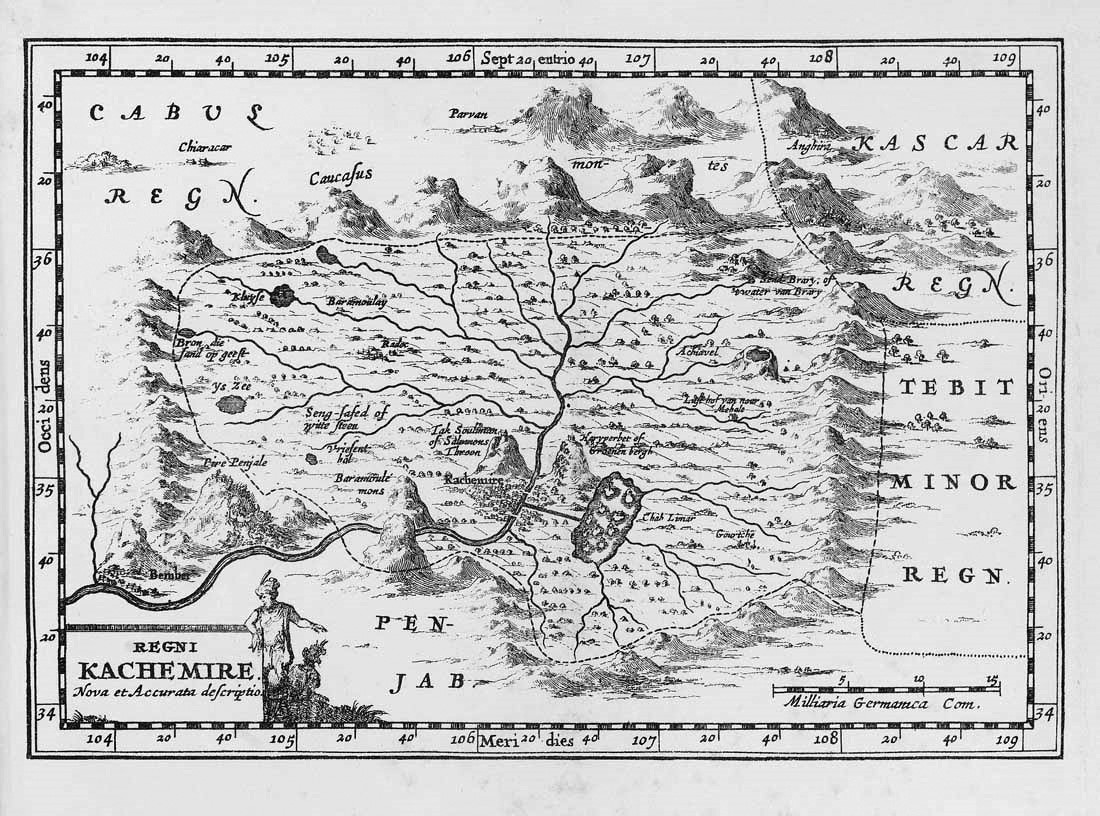 A map, based on Bernier’s description of Kashmir, was first included in the Dutch version of his travel account published in Amsterdam in 1672. Irving Brock in his 1826 edition of the book (re-edited by Archibald Constable in 1891) noticed that the map was ‘curiously incorrect’ and added ‘a new and accurate delineation’ . The map here is the new one.