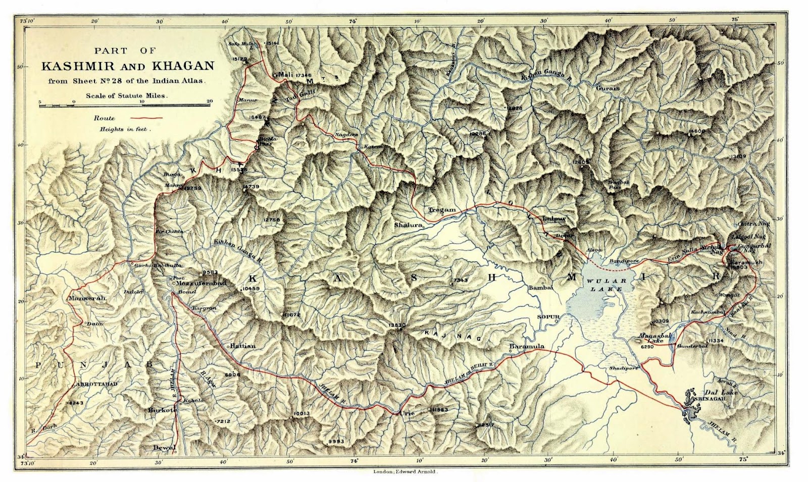 Map of Kashmir from ‘Five months in the Himalaya a record of mountain travel in Garhwal and Kashmir’ (1909) by A.L. Mumm.