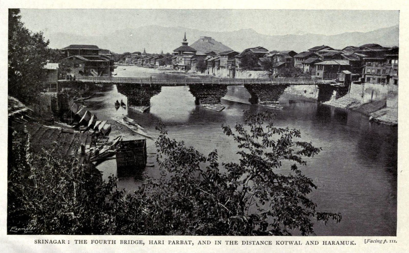 | Srinagar: The Fourth bridge, Hari Parbat, and in the distance Kotwal and Haramuk |