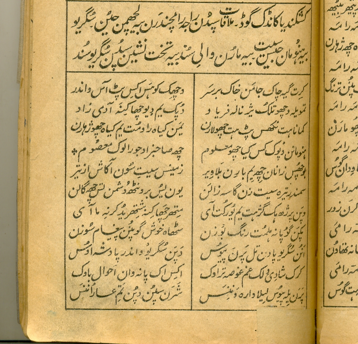 The Chapter deals with meeting of Ramchanderji and Lakshmanji with Hanuman and Sugrev and death of Vali and coronation of Sugrev at the hands of Ramchandar Ji. Here are some verses of the chapter in Roman Kashmiri with English translation.