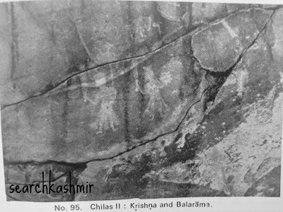 | Krishna-Baldev etched on a rock in Chilas, Gilgit-Baltistan. Dated around 6th century AD. The left figure has a crown on his head but the right one has a crescent-topped headgear. Both of them are holding a club in their right hand. The left figure is holding a plough-topped banner in his left hand and the right figure is having a discus on his left hand. Left one is Balaram and the right figure in Krishna. Kharoshthi inscription in Scythian style accompanying the figures reads: “Of (Bala) Rama (and) Krishna, (erection) of Dhamaputa.’ Source: Chilas: The city of Nanga Parvat. By Ahmad Hasan Dani, Islamabad (1983). |