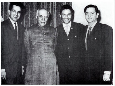 Dilip Kumar, Dev Anand and Raj Kapoor with Mr. Nehru. 1958 by Kewal Mehra. The story of how I came across it here. |