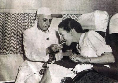 Pandit Nehru on board the first BOAC jet plane, on a 45-minute flight to Nanda Devi. Nehru is seen lighting the cigarette of the then Deputy High Commissioner’s wife Mrs Simon. Shot by Homai Vyarawalla .