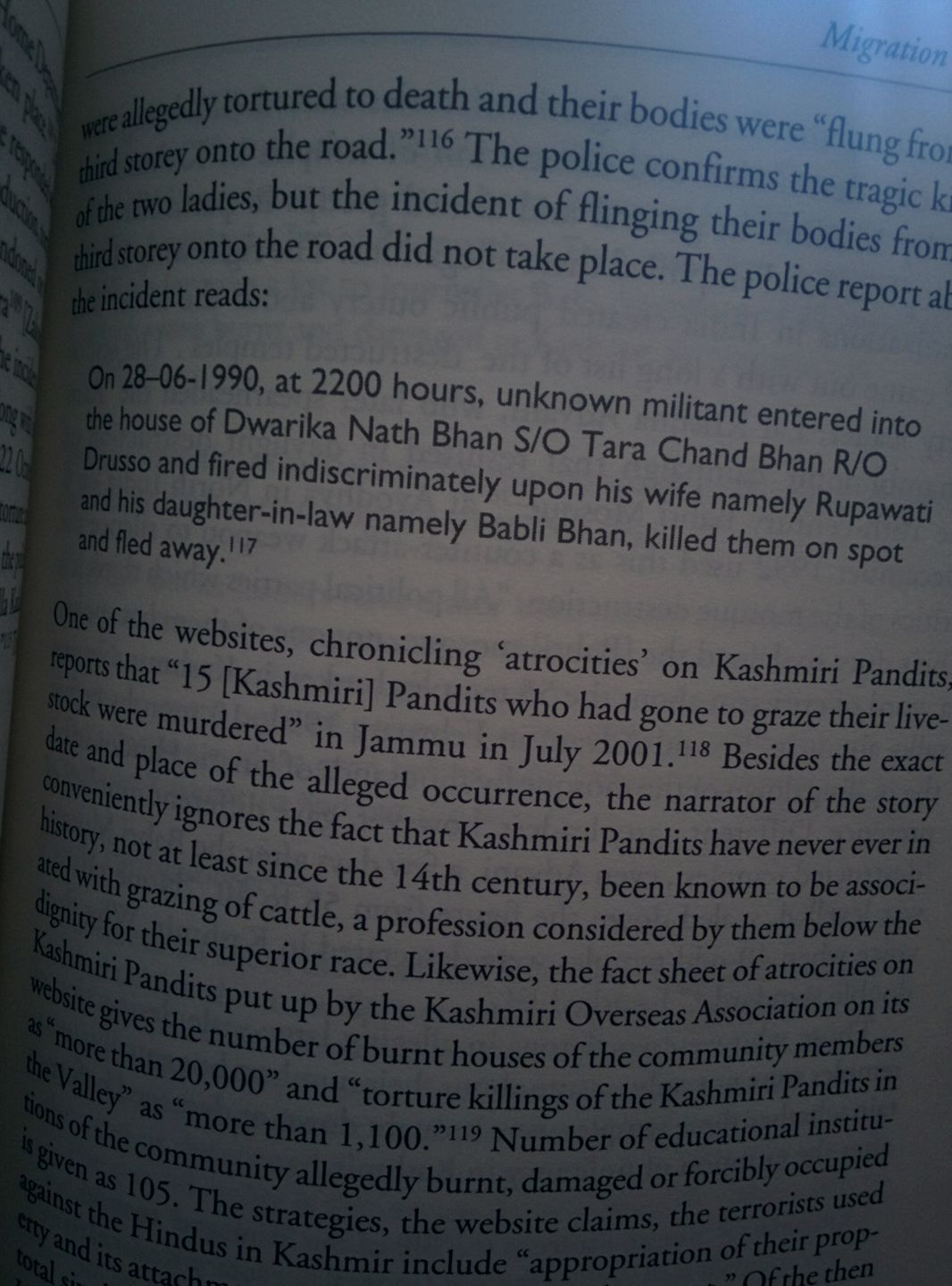 In dealing with exodus of Kashmiri Pandits in 1990, reader is told using account of Muslims that Pandits left Kashmir in aeroplanes. The usual Jagmohan Conspiracy is forwarded as the culmination of centuries old cruel games that pandits like to play.