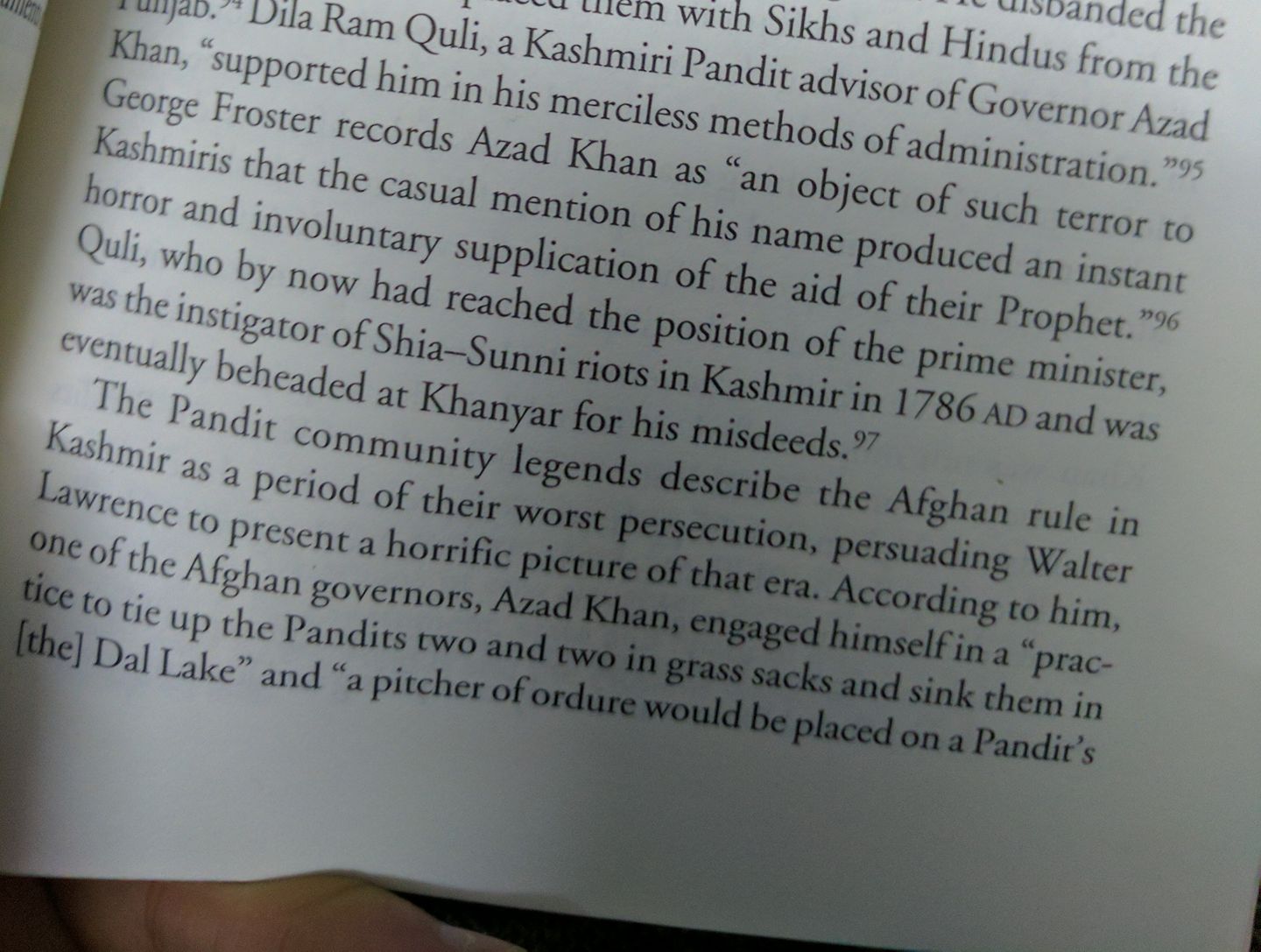 Reader is not told that GMD Sufi, again a Muslim, in 1949 in his “Kashir A History Of Kashmir” wrote at length about the tyrannical Afghan period and mentions persecution of Hindus as well as Shias. Sufi does not use Kachru as source for Afghan period but uses him for Sikh period during which he lived. For Afghan period he uses Muslim sources, works of afghan era, all of which mention persecution.