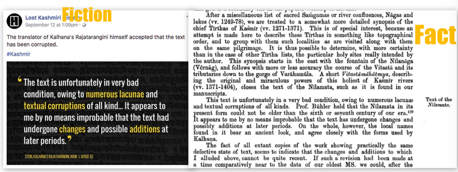 Fact: On page 377 of “Rajatarangini: a chronicle of the kings of Kasmir, Volume 2” Stein is infact talking about the condition of a manuscript of Nilmatapurana found by Georg Bühler. More particularly, Vitastamahatmya. Not Rajatarangini.