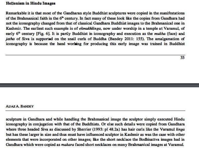 According to Bashir, cunning Brahmins modified (disfigured) Buddhist statues to give them Hindu look. He calls it Buddhist statue…not Gandhara statues. Bashir calls it “5th century Buddhist statue.”If one reads what he has written…there is only one conclusion that a lay reader in Kashmir with no real access to Hindu culture or original sources would assume: Brahmins mutilated Buddhist statues to make them Hindu. He bases his claim based on writing of Aijaz Bandey about an Ekamukha Shivling in a temple in Baramulla. Something he reveals (rather hides) in bibliography. And if one actually reads Bandey about that Shiv ling…we read something else completely. We read about how Gandhara art influenced Hindu art in Kashmir. Bandey does not make it sound like Hindus disfigured Buddhist statues to make Hindu gods out of them. Bandey writes about art assimilation. He even accepts there were already such Hindu images in Gandhara. Khalid Bashir Ahmad’s skewed logic if one extends to Muslim art in Kashmir, all Kashmiri traditional Muslim Ziyarats are Buddhist and not just influenced by Buddhist art.