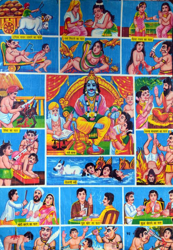 | Hindu afterlife Punishments given in Garuda Purana. A poster found at a little shop in Jammu. Febuary 2012. Mother tells me punishment for those who waste salt is that they pick you up by your eyelashes. |