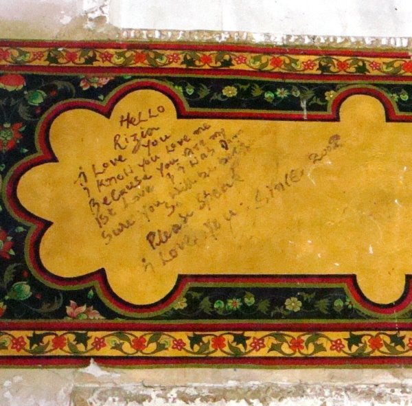 Photograph: A teenage love story on a wall of the central monument at Shalimar Garden in Srinagar, Kashmir.