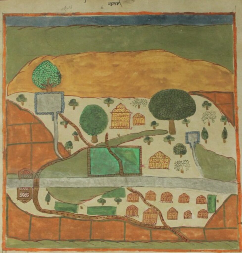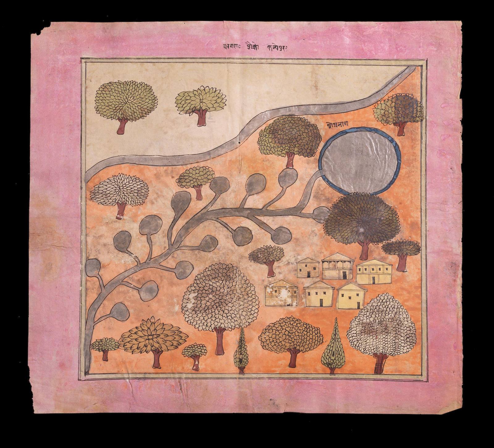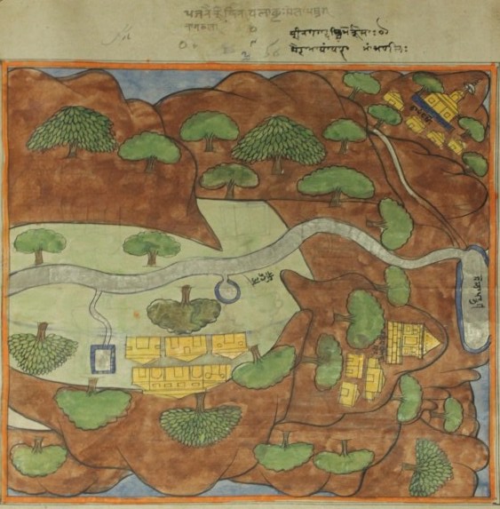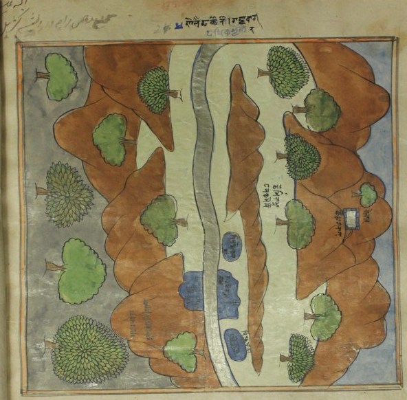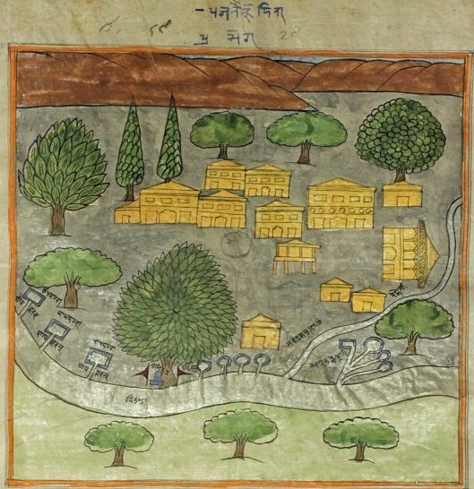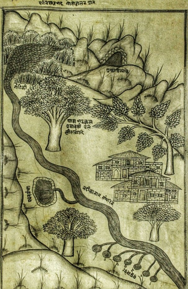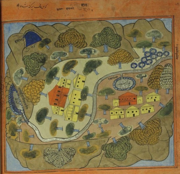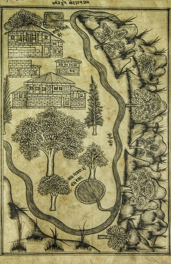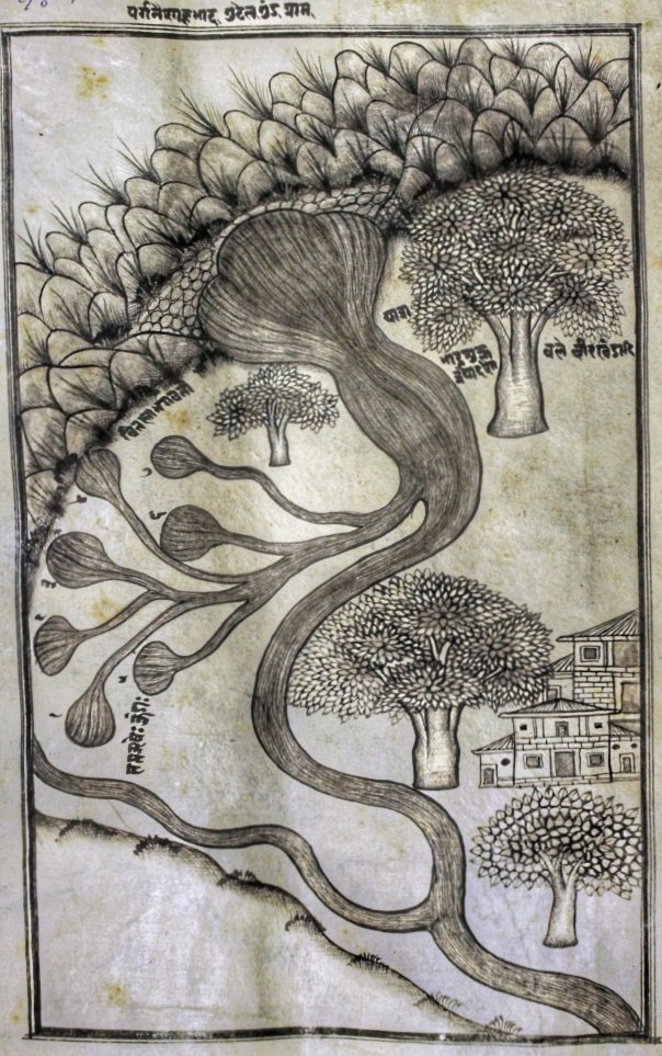 What made Sahib Ram Kaul stand out was not just his skills of the languages (Sanskrit, Persian [he studied in a Persian language Maktab (school)] till the age of 18, picking up sanskrit only in adulthood) and his work on texts (ranging from shastras, kvyas, itihasa, commentary on erotica [Pañcasāyaka of by Kaviśekhara Jyotirīśvara], translation of work on Islamic morality [Ahalq-e Mohseni/Viraratnasekharasikha]) but his rooted understanding of geography of Kashmir in which he was able to visualize the past from present. The materialization of that vision of Sahib Ram Kaul was Kashmiriatirathasangrah, a work compiling all the major holy spots of Kashmir, mostly various nagas/springs all over the valley based on texts like Nilamatapurana, Kalhana’s Rajatarangini and Abu’l Fazl’s Ain-i-Akbari. Along with notes (in Sanskrit) Tirathasangrah had maps of the holy sites with topographical identifiers, local lore and village names. To compile the work, pandits across the valley were roped in to help collect the material. If there was a local spring or a holy village in some remote village, even that was recorded by Sahib Ram diligently. However, the work was never completed as Sahib Ram died in around 1870 or 72. The incomplete work already comprised hundred on pages of folia with maps, many of them incomplete, just sketched, not painted, some with no notes. The monumental work however was taken up again a few years later by his son Damodar Kaul