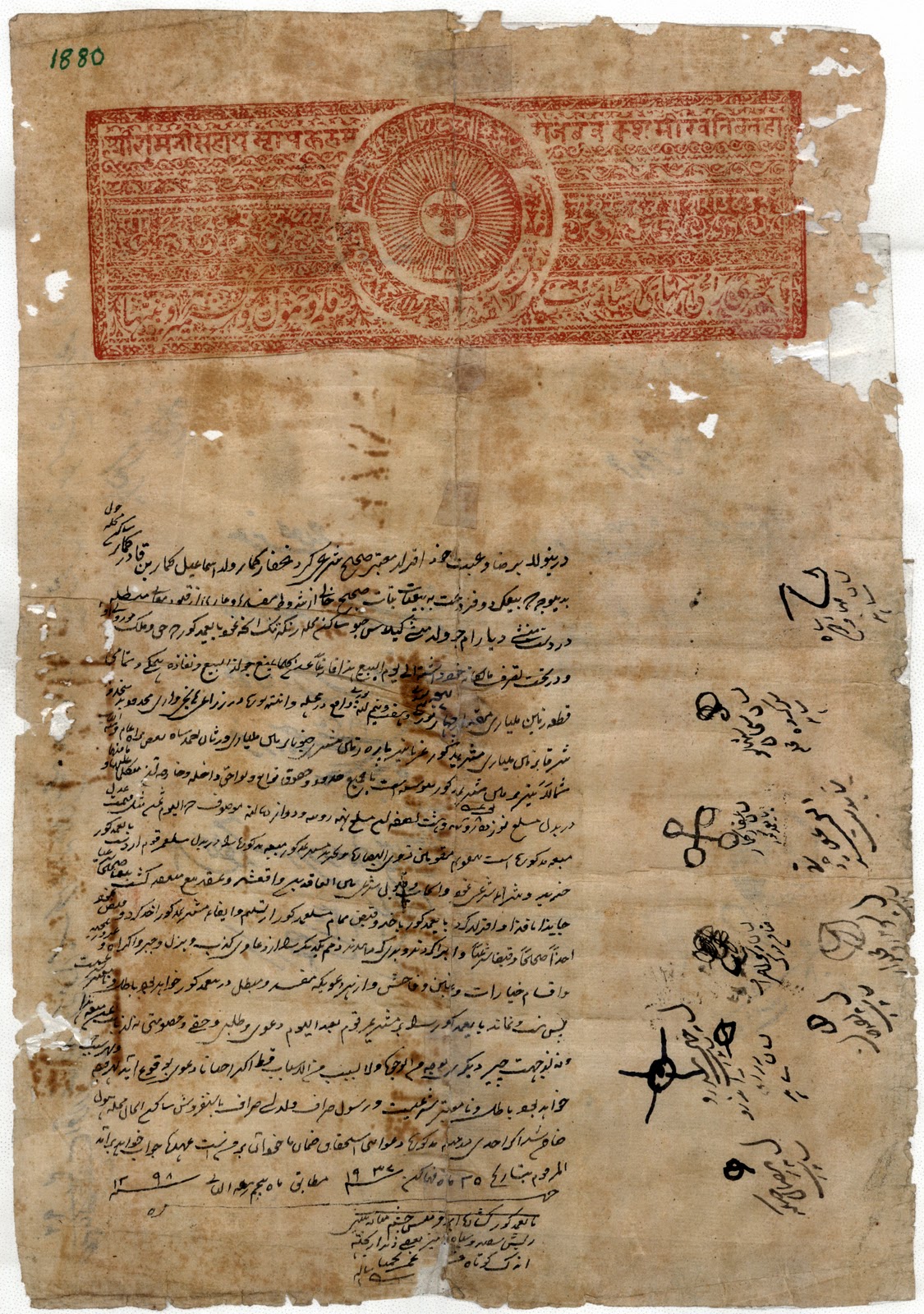 […]three original legal agreements pertaining to Sale purchase deals executed by my great grand father Munshi Daya Ram in 1872 AD, 1876 AD and 1880 AD which I located in a heap of junk in 2003. The said agreements have been drafted in Persian and the revenue stamp /paper is bilingual i.e Persian and Sanskrit . A few words / signatures are in 1872 document are in Sharda script. The dates of the said agreements english in the text are given in Bikrami and Hijri Samwants which have bee calculated are as follows: