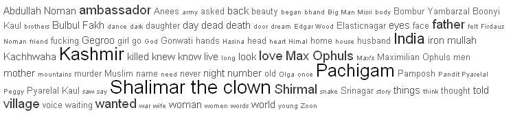 Posted on July 17, 2009October 12, 2020 by Vinayak RazdanShalimar Clown cloud Common Terms and Phrases most used in Shalimar the Clown Via. Google Books Related Posts:Complete Chronology of All Kings of KashmirKangir: A Traditional Fire-pot of Kashmir | by…download Books on Kashmir for freeAldous Huxley in Kashmir.Review: "Kashmir: Exposing the Myth behind the narrative"People's history of Kashmiri Hanji