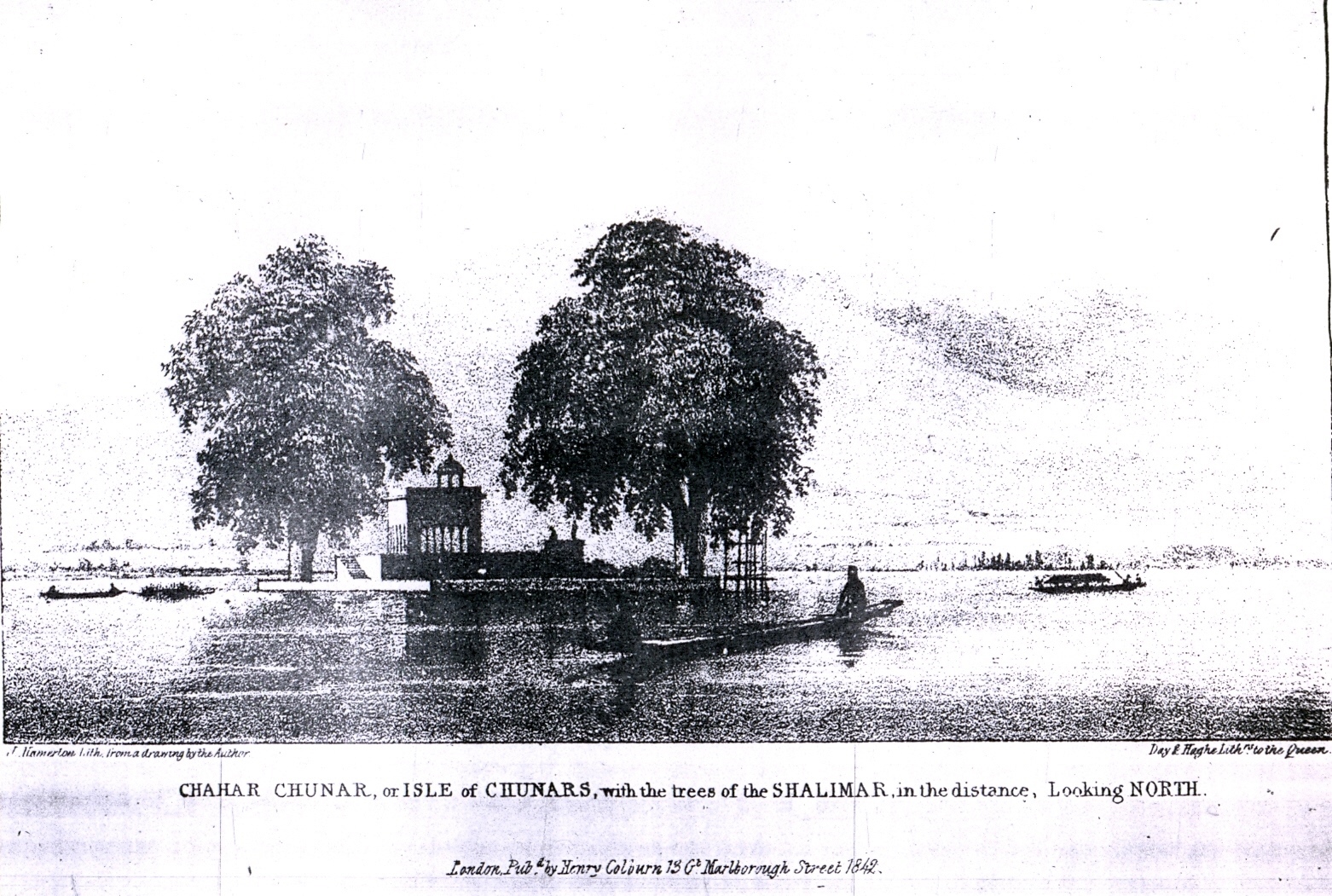 | Sketch of Charchinari island in Dal Lake by by Day & Hagelitch. Faint view of Mahadev and SriDwara mountains is visible in the background. |