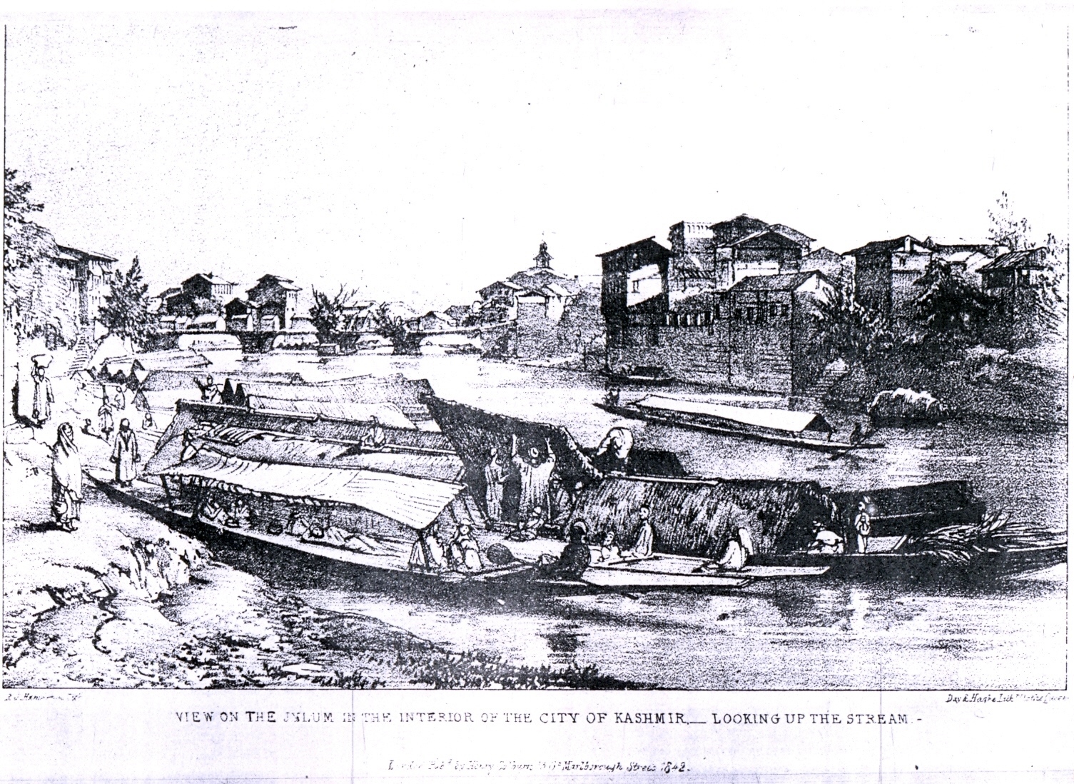 | Sketch of Interior of Srinagar along Jhelum 3rd bridge (Fateh Kadal) and Shah Hamdan Ziarat in the distance drawn by Day & Hagelith |
