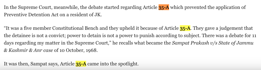 In this case too, court [Justice P.K. Goswami] held the act valid and without relying on article 370 or 35(a). It was held valid because of article 31-A of Indian constitution. Art. 31-A, was inserted by the Constitution First Amendment Act, 1951, and provided for acquisition of estates of the nature referred to in various clauses, declaring that such laws shall not be deemed void on the ground that they take away any of the rights given by Article 14 or 19 of the Constitution.