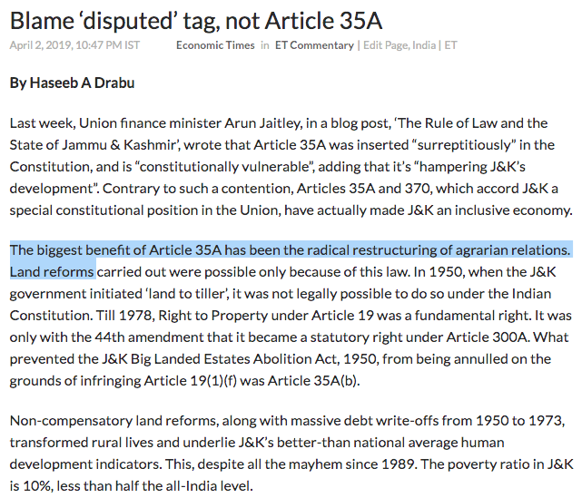 Article 31 was the main reason why earlier land reform acts in other states like Kerala and Bihar ran into lot of trouble. To circumvent it ninth Schedule of the Constitution was introduced [the current standing of which is also controversial today because essentially due to some ruling it seems Judiciary today had the final say of defining the spirit of the constitution]. It is interesting that while Nehru backed Sheikh’s land reform in Kashmir, in Kerala, first democratically elected communist government was dismissed over the issue. It is however important to remember Kerala went on to implement Land reforms more successfully without having Article 370 to back the move. It is pure propaganda to claim that land reforms would not have been possible without Article 370. It is a malicious thought being sold to Kashmiris, fanning their xenophobia.