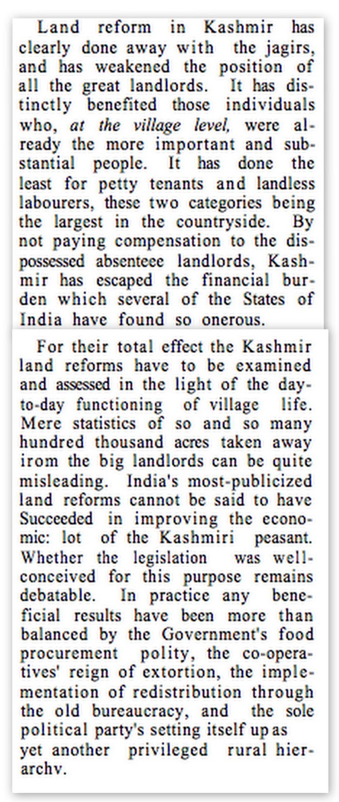 | Rise of “khadpanches” (people, who hang around the village officials in the hope of gaining influence or wealth) “The Kashmir Land Reforms Some Personal Impressions” by Daniel Thorner EPW, 12th September 1953 |