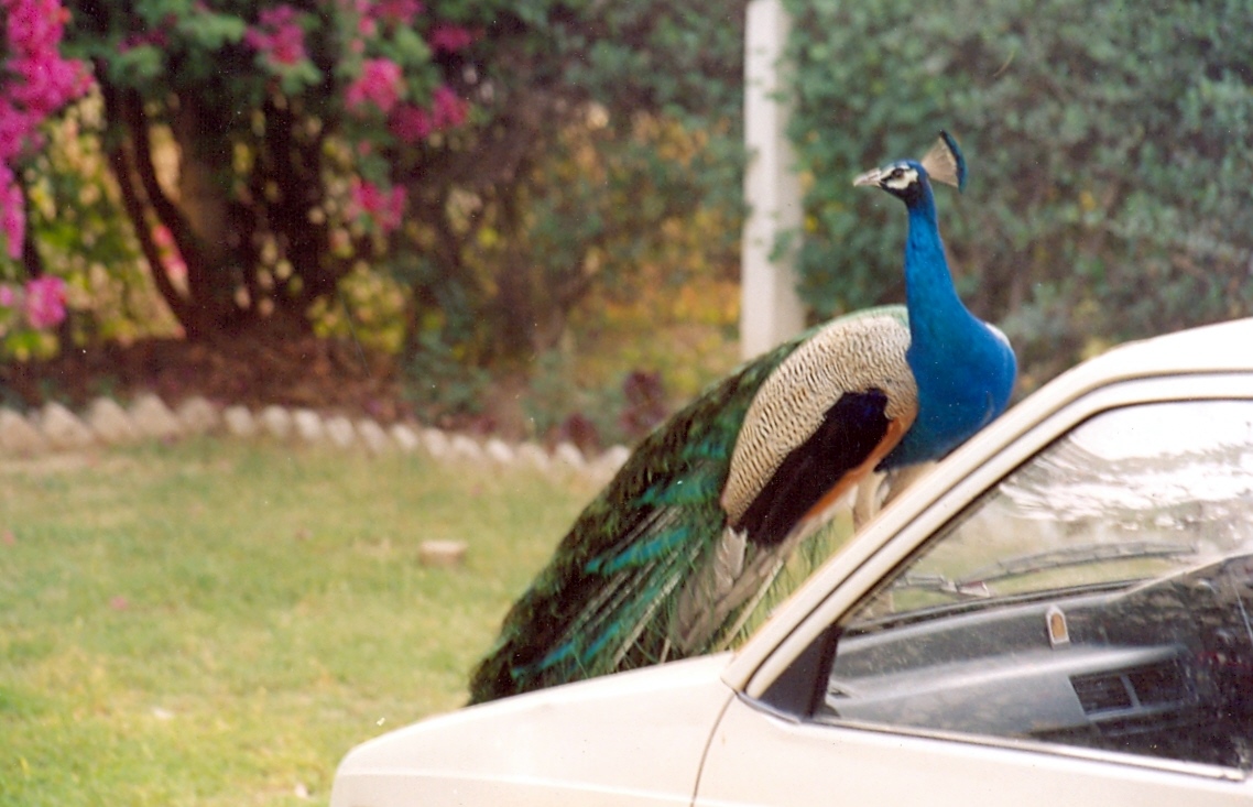 | Peacock perched on a Mauruti 800 at outskirts of Jammu |