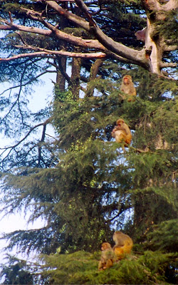 | Resus monkeys perched in a three tire position on a Deodar Tree |