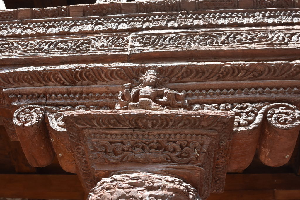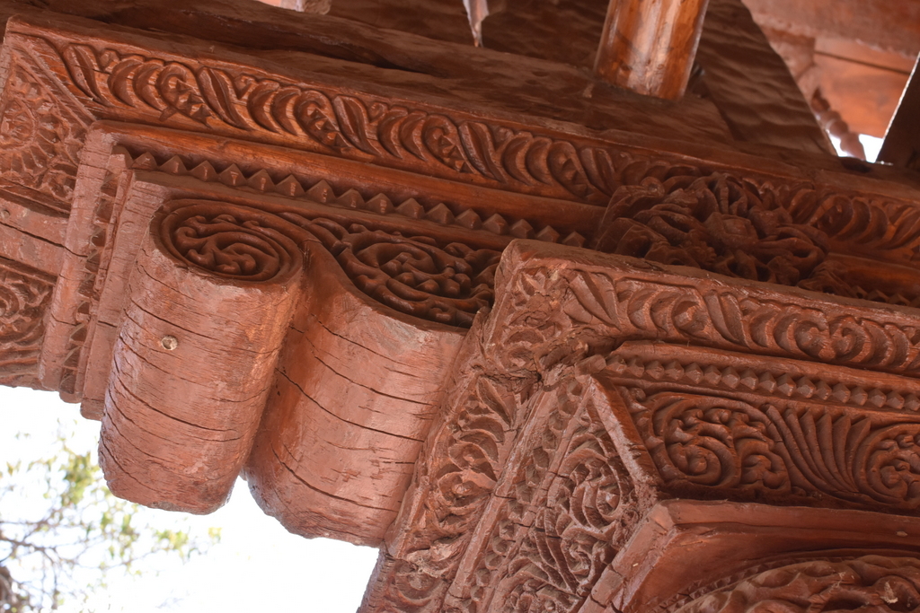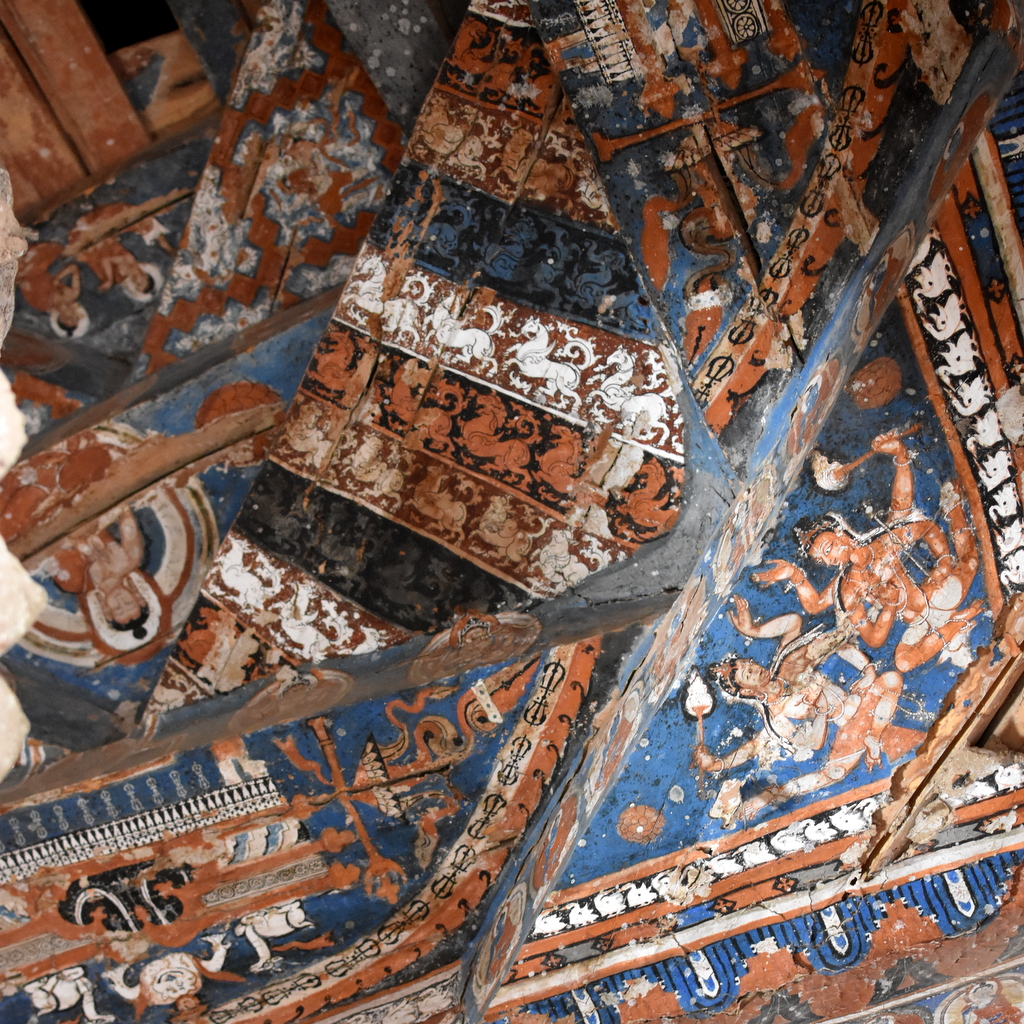 | Inside the temple: Pattern drawn on the beams is now believed by scholars to have patterned on the design of Kashmiri textile, making it the only surviving sample of Kashmiri cloth design of medieval times. |