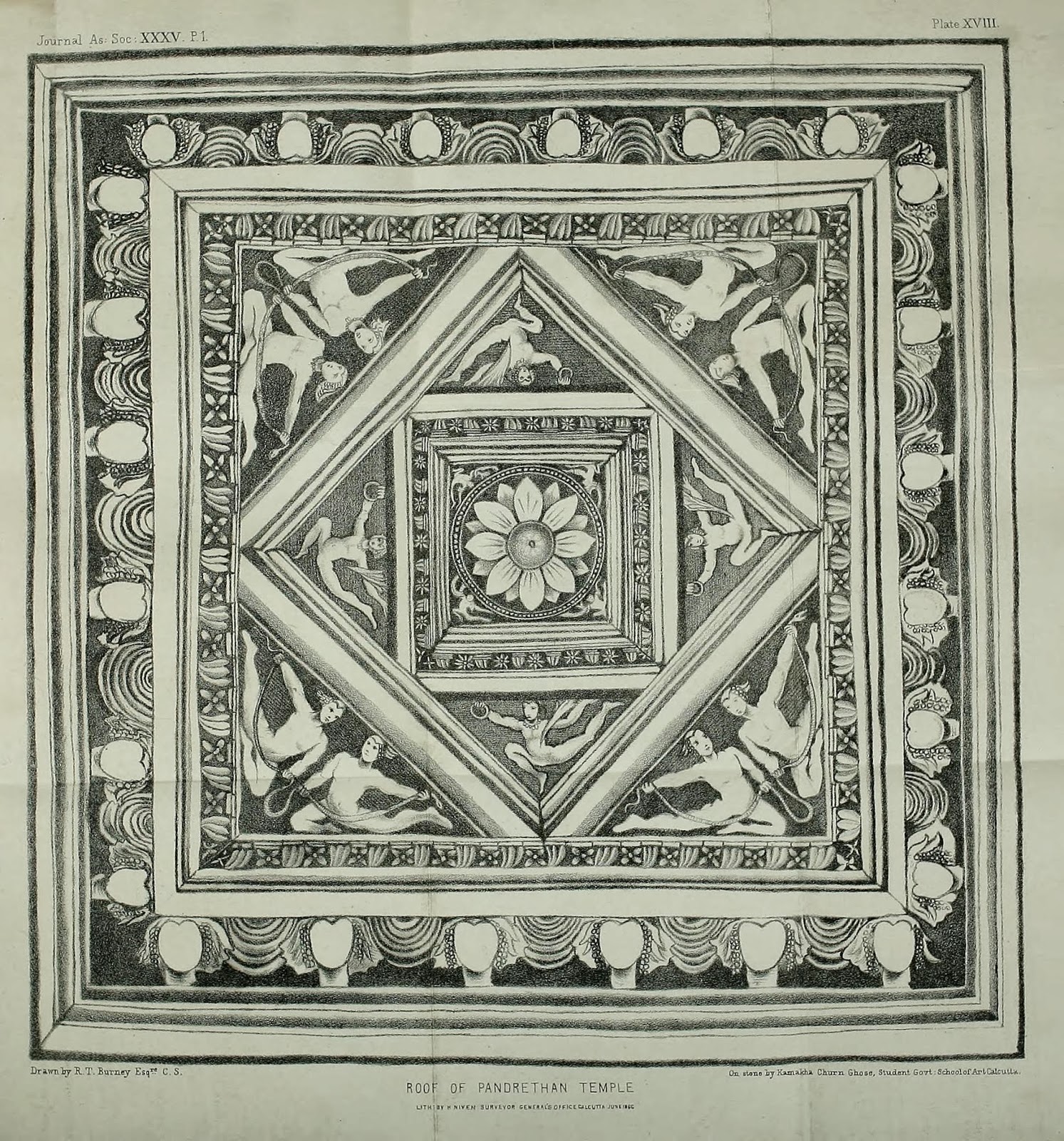 | Copy of Pandrethan ceiling prepared by one R.T. Burney was presented by W.G. Cowie in his 1865 paper ‘Notes on some of the Temples of Kashmir, especially those not described by General A. Cunninghan’ (Journal of The Asiatiic Society of Bengal Volume 35, Part 1. 1866) |