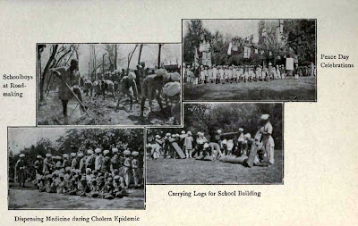 (Clockwise:) Schoolboys at Road making, Peace Day Celebration, Carrying Logs for School Building, Dispensing Medicine during Cholera Epidemic