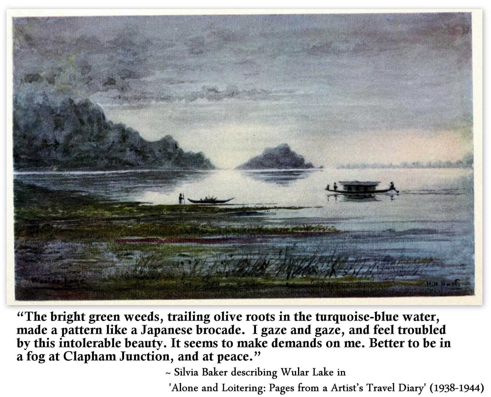Quote: Silvia Baker, ‘Alone and Loitering: Pages from a Artist’s Travel Diary (1938-1944)’ . She was describing her visit to Wular Lake in around year 1944. [via: exiledstardust]