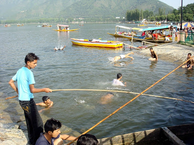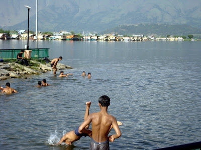 The boy kept pushing his friends into the water. Finally, they all ganged up on him, caught hold of his legs and arms and swinging his body in air, prepared to throw him into the water. The boy started screaming, ‘I don’t know how to swim! I will die! I will die!’ His friends got tired of his drama. They let him be. Some minutes later, one of his friend talked him into going into the water. He agreed. Once in water, he almost drowned his friend by riding onto his head. ‘What’s wrong with you! You want us to get killed. Nothing will happen! I won’t let you go’. The boy wasn’t so sure, he kept repeating, ‘I don’t know. A boy drowned at this very spot a couple of days ago. Swear on your mother you won’t let go of my hand. I will die. Die’ The boy was a genuine dramabaaz, anybody could tell. There was also a slight chance that he even knew swimming. A couple of minutes later he was (while still holding onto his friend’s neck) splashing his legs wildly in water, exclaiming, ‘I can swim! I can swim!’. His other friend, standing at shore, threw a brick (deliberately mis-directed) at him. Of course, it missed and hit the water, creating a big sploosh. The boy looking genuinely offended told them, ‘Swear on mother, you won’t do that again. You want to see dead!’ All the boy were in their late teens. If you witness a scene like this anywhere else in this part of the world, boys having fun like this, there is a good chance that they will also be rhyming insults at each other’s mother and sister – it’s almost a way of showing endearment among males. It seems Kashmir (at least most of it) is still too idyllic to move in that direction. Pleasures are simple. Friends are friends. Mothers are mothers. Swimming is swimming.
