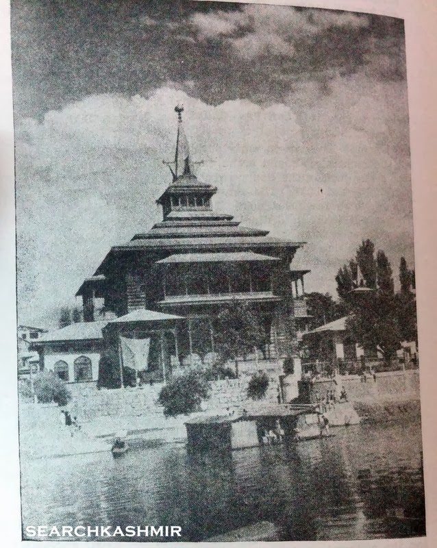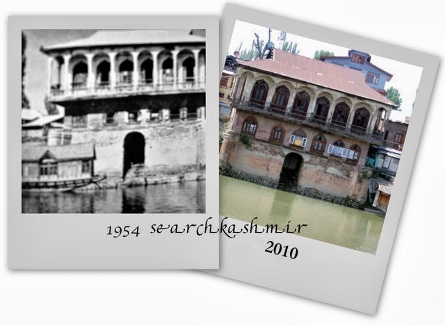 Below the Marisamgama at the present Malyar Ghat stood the temple of Vardamanesa of which nothing is left today . A Linga serving as lamp post in a nearby Mosque believed to be from the original Vardamanesa temple was removed and installed in Malyar Temple in 1818. Immediately below Habakadal Bridge on the right bank is the Somyar temple, site of the ancient Somatirtha . Similarly situated on the left bank is Purushyar the site of ancient temple of SadaSiva. Between Haba Kadal and Fatehkadal on the right bank of Vitasta is the locality of Narparistan near Malikangan, stood the temple of Naresheri which was converted into a Ziarat during the muslim rule. Further downstream between Fateh Kadal and Zaina Kadal also along the same bank was bank was located the temple of Kalisheri which was destroyed and rebuilt as ziarat of Shah Hamdan by Sikandar Butshikan. The oldest bridge over the Vitasta in the City was known as Mahasetu it was a boat bridge like a modern poonton bridge which could be removed during emergencies like war etc. At the location of the Mahasetu Zainulabdin built the first permanent timber bridge across the Vitasta in 15 th century which came to be known as Zaina Kadal and other muslim rulers followed by building a number of timber bridges in the city and elsewhere across the Vitasta. Again on the right bank of the river betwen Zainakadal and Alikadal is the tomb of the queen of Sikandar Buthshikan and burial place for other muslim rulers known as Mazar Salatin. The Tomb which is built entirely of bricks very similar in architecture to the tomb of Bibi Jawandi at Uchchh Sharif near Multan in Pakistan. Its foundations & embankments on the riverside and material used in the surrounding walls betray it to be site of an ancient Hindu temple.