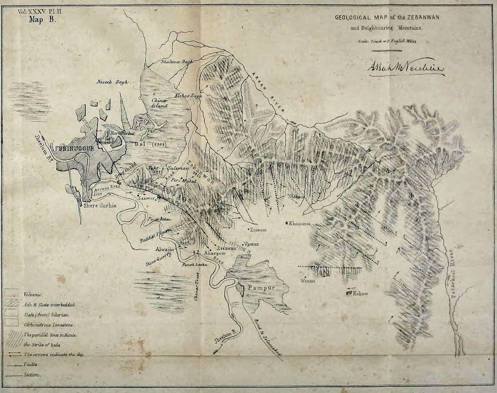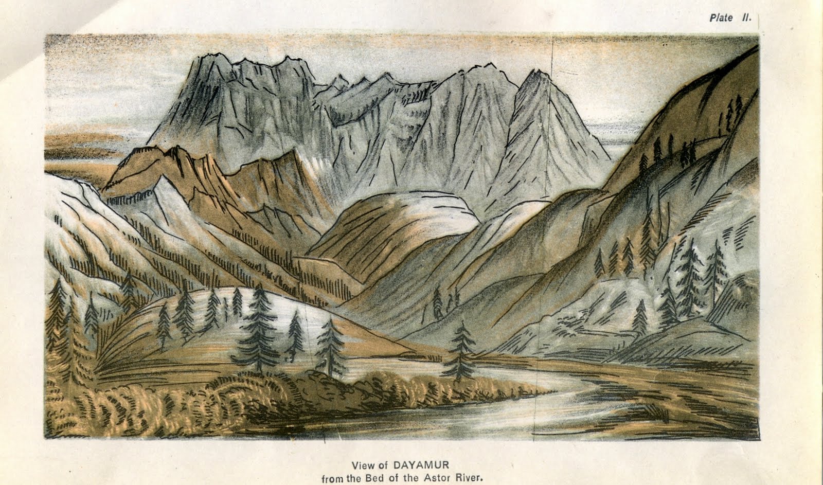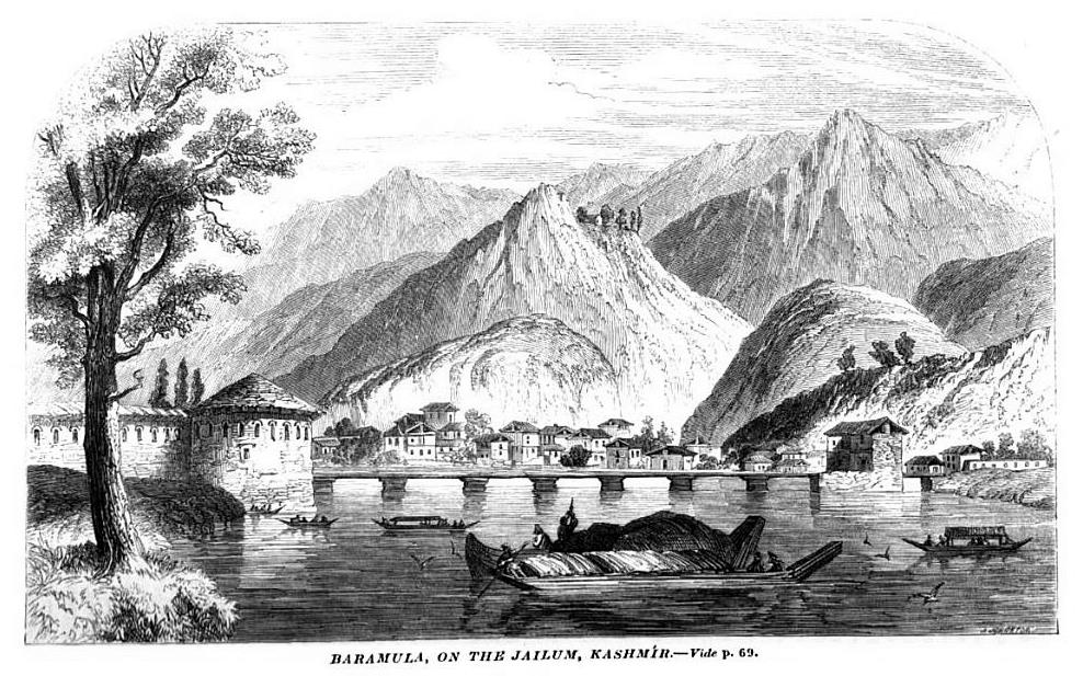 Baramulla bridge with Gosain Teng in background (with in Kaznag and Shamasabri ranges, an extension of the Pir Panjal Range). Illustration published in ‘Church Missionary Intelligencer’ (1854).
