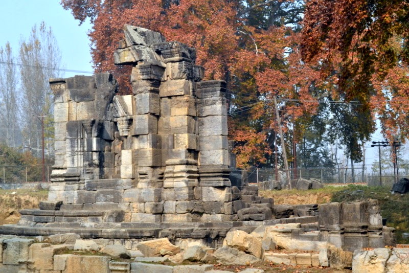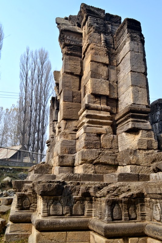 | Cunningham noticed an interesting fact that while the temple of Awantiswamin at Avantipur had lost its central structure and yet retained its wall. At Sugandhesa the central structure was intact while the walls were lost. A recent study of stones at Sugandhesa suggests, “collapse in the tenth or eleventh century, and significant damage in 1885, with at least one intervening earthquake possibly in the seventieth century.” [link] |