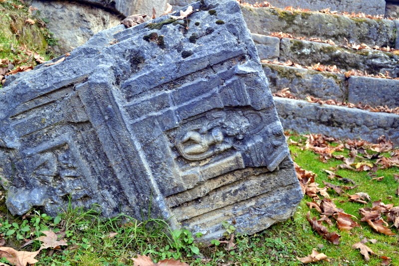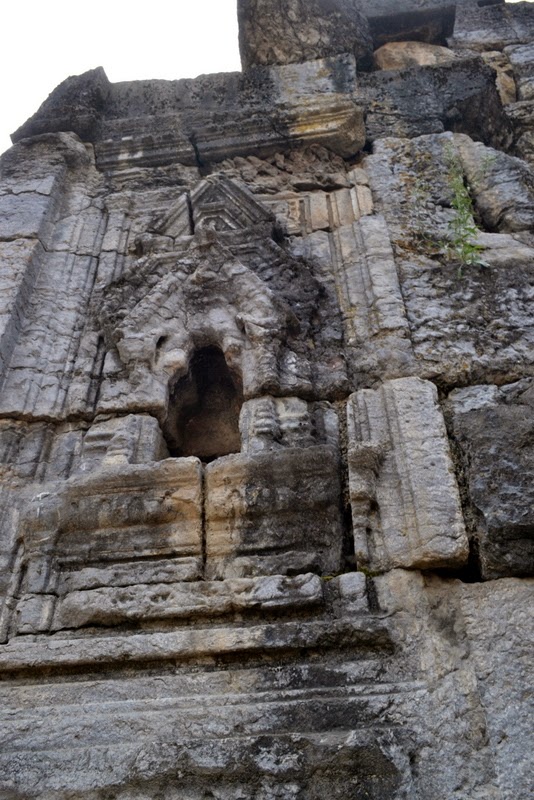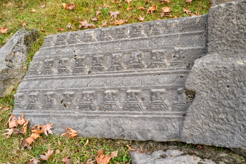 Among the architectural fragments lying loose on the site, the most noteworthy are (a) two fragments of fluted columns with their capitals, (b) two bracket capitals with voluted ends and carved figures of atlantes supporting the frieze above, (c) a huge stone belonging to the cornice of the temple, bearing rows of kirtimukhas (grinning lions’ heads) and rosettes, and (d) a stone probably belonging to the partition wall of the entrance, having (1) two small trefoiled niches in which stand female figures wearing long garlands and (2) below them two rectangular niches, in one of which is an atlant seated between two lions facing the spectator, and in the other are two human-headed birds.