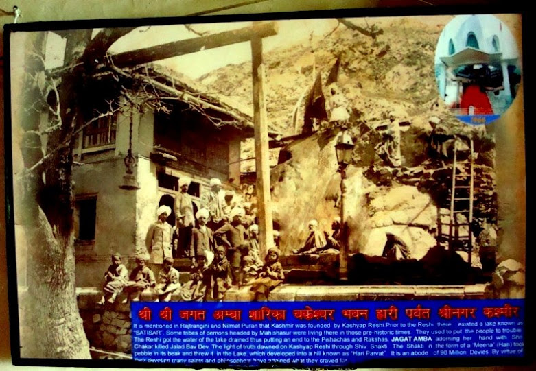 An Old Photograph of Hari Parbat (Chakreshwar) that hangs inside one of the buildings to the left of the central structure. Probable date of the photograph: 1920s. The township surrounding the temple was originally created by the Mughal Emperor Akbar who setup this new township as his base here after his successful conquest of Kashmir in 1585.