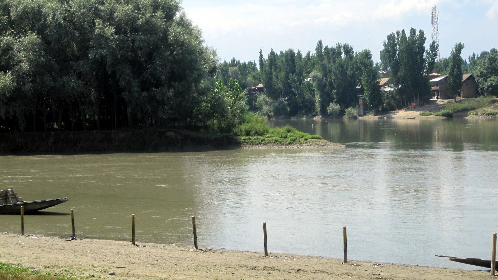 The present Vitasta -Sindhu -Samgama the conflunce of Jhelum and Sind rivers at Naranbagh near Shadipur. The river in the left foreground with greyish coloured water is the Sind river and the other with the bluish green coloured water in the right background is the Jhelum. Suyya the able engineer of King Avantivarman by his skill shifted the position of Vitastasindhusamgama from Parihaspura Trigami area to its present location in the vicinity of Sundribhavana (Naran Bagh) by forcing the course of Vitasta north east wards by blocking its original course with embankments to reclaim the cultivable land from flood prone areas and marshes. A Vishnu temple by the name of Yogavasmin was also built by Suyya at the instance of Avantivarman.